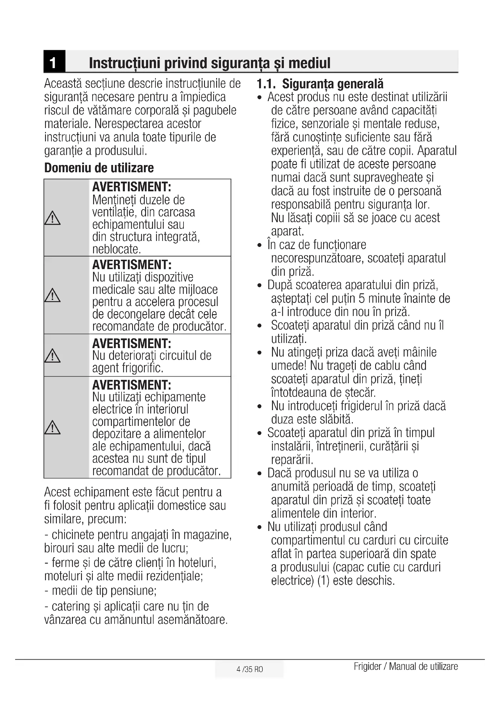 AVERTISMENT: Nu utilizaţi echipamente electrice în interiorul compartimentelor de depozitare a alimentelor ale echipamentului, dacă acestea nu sunt de tipul recomandat de producător. Acest echipament este făcut pentru a fi folosit pentru aplicaţii domestice sau similare, precum: - chicinete pentru angajaţi în magazine, birouri sau alte medii de lucru; - ferme și de către clienţi în hoteluri, moteluri și alte medii rezidenţiale; - medii de tip pensiune; - catering și aplicații care nu țin de vânzarea cu amănuntul asemănătoare. 1.1. Siguranţa generală