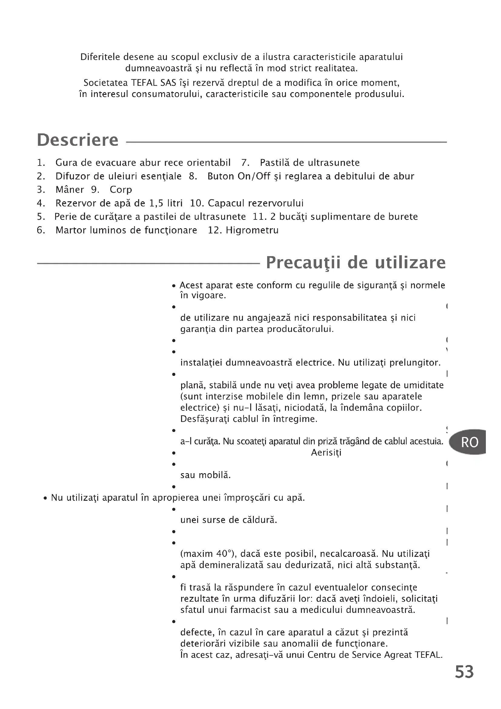 Sfaturi pentru utilizare Umidificatorul AROMA compact TEFAL Baby Home produce abur rece care măreşte gradul de umiditate din încăpere. Gradul de umiditate reprezintă procentul de apă conţinut în aer. Umidificatorul dumneavoastră este livrat cu un higrometru, care permite supravegherea acestei valori. Pentru un confort sporit, gradul de umiditate trebuie să fie cuprins între 30% şi 50%. Umidificatorul dumneavoastră este livrat cu sistemul AROMA, care permite difuzarea de uleiuri esenţiale. Datorită aburului rece, aceste uleiuri nu sunt afectate, deoarece nu sunt încălzite. Funcţionarea umidificatorului Întoarceţi rezervorul cu mânerul său şi deşurubaţi capacul - fig. 1. Umpleţi rezervorul de apă la robinet şi strângeţi la loc capacul - fig. 2. Puneţi la loc rezervorul pe corpul său şi introduceţi aparatul în priză. Aşezaţi aparatul la înălţime şi orientaţi gura de evacuare a aburului înspre centrul încăperii. Nu-l îndreptaţi înspre un copil. Porniţi aparatul rotind butonul în poziţia ON şi reglaţi debitul de abur rece continuând să rotiţi butonul înspre dreapta - fig. 3. Funcţia AROMA Dacă doriţi să utilizaţi un ulei esenţial, înainte de a porni aparatul, îndepărtaţi gura de evacuare a aburului, turnaţi 4-5 picături pe burete - fig. 4 şi puneţi-o la loc. Pentru a utiliza cât mai bine sistemul dumneavoastră AROMA, vă recomandă să alegeţi, împreună cu farmacistul dumneavoastră, uleiul esenţial care va asigura cel mai mare confort pentru copilul dumneavoastră. Dacă buretele este prea impregnat, dispuneţi de doi bureţi suplimentari. Pentru a schimba buretele, retrageţi difuzorul - fig. 5 şi schimbaţi buretele. Rezervorul de apă, având o capacitate de 1,5 l, asigură o autonomie de aproximativ 15 ore în poziţia maximă şi 35 de ore în poziţia minimă. Atenţie, difuzarea de uleiuri esenţiale nu este inofensivă. Utilizarea acestora nu trebuie să fie sistematică şi permanentă. Nu puneţi uleiuri esenţiale decât pe bureţii destinaţi în acest scop, niciodată în rezervor sau pe produs, deoarece există riscul deteriorării aparatului. Nu amestecaţi aromele: pentru aceasta, clătiţi bine buretele sub apă cu detergent pentru vase. NU UTILIZAŢI,