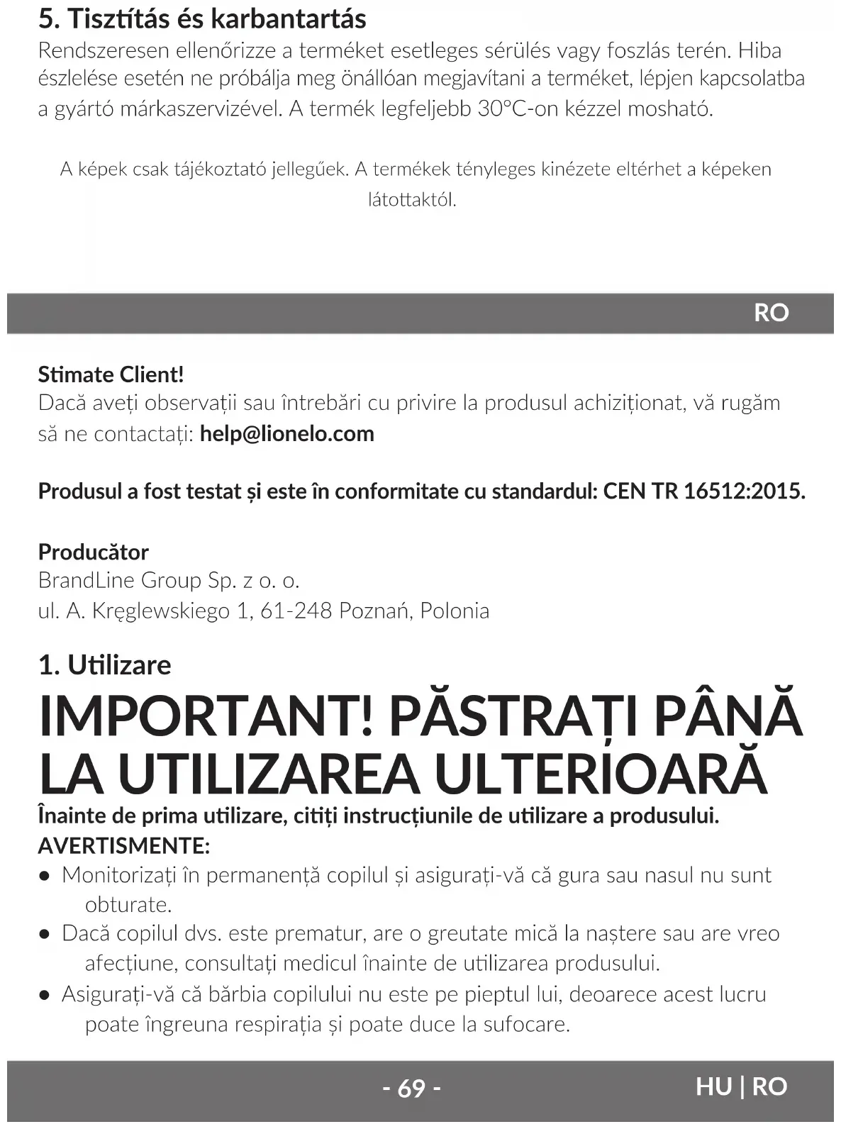 Bărbia copilului nu trebuie să se sprijine niciodată pe pieptul persoanei însoțitoare, deoarece aceasta obstrucționează parțial căile respiratorii ale copilului. Persoana‑ 71 ‑ RO care folosește marsupiul trebuie să se asigure că tractul respirator al copilului este liber și că acesta respiră corect în orice moment. Așezați corect copilul în marsupiu, acordând atenție așezării corecte a picioarelor. Vericați regulat poziția copilului pentru a vă asigura că este în poziția corectă - în centrul marsupiului, cu picioarele desfăcute larg și capul ținut drept și să nu cadă în jos sau în lateral. Vericați în mod regulat mâinile, picioarele și labele picioarelor copilului pentru a vă asigura că nu sunt strânse de marsupiu. Pentru a evita rănirea copilului atunci când învățați cum să-l puneți în marsupiu, desfășurați acvitățile pe pat sau pe altă suprafață moale cu ajutorul unei alte persoane adulte. Ori de câte ori este posibil, puneți și scoateți marsupiul lângă o suprafață care prezintă siguranță pentru copilul dvs. șîntr-un loc sigur. Fiți deosebit de atenți când purtați copilul pe spate. Suportul nu trebuie ulizat de persoane cu probleme de sănătate care ar putea afecta negav ulizarea în siguranță a produsului. Dacă persoana care folosește marsupiul apar probleme la umăr, spate sau gât, ar trebui să înceteze să mai folosească marsupiul și trebuie să consulte medicul.