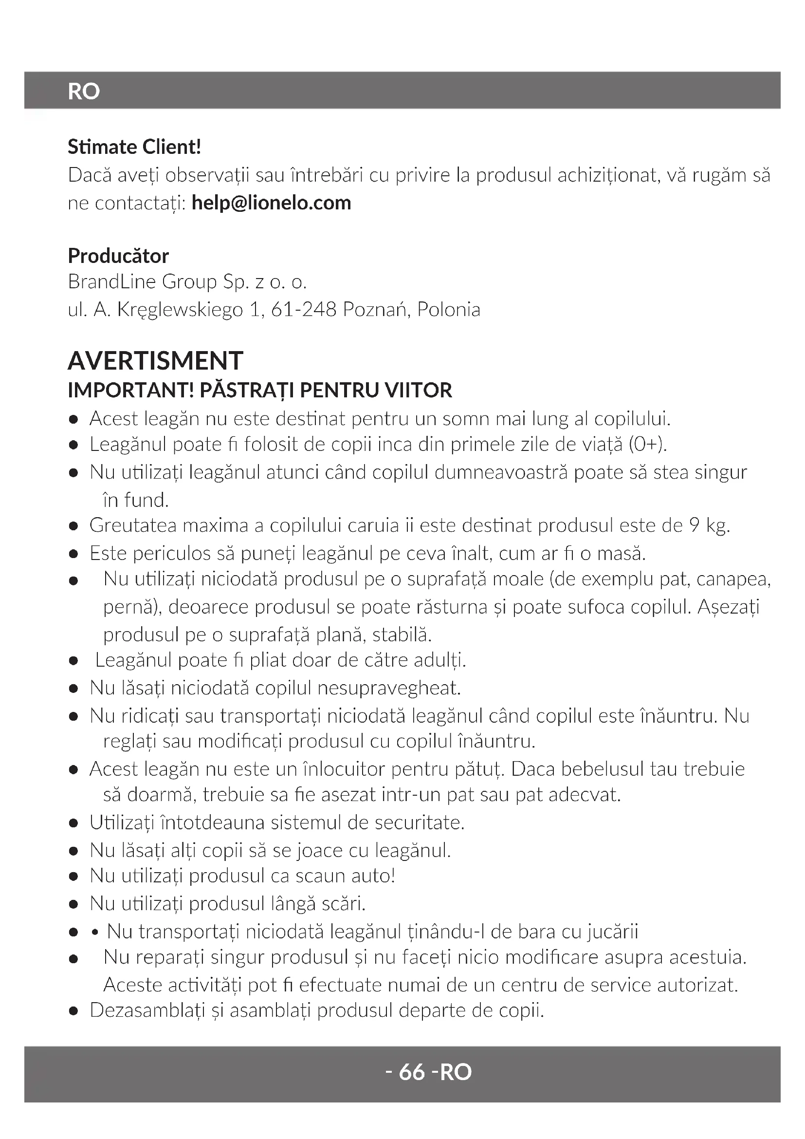 - Acest leagăn nu este un înlocuitor pentru pătuț. Daca bebelusul tau trebuie să doarmă, trebuie sa e asezat intr-un pat sau pat adecvat.