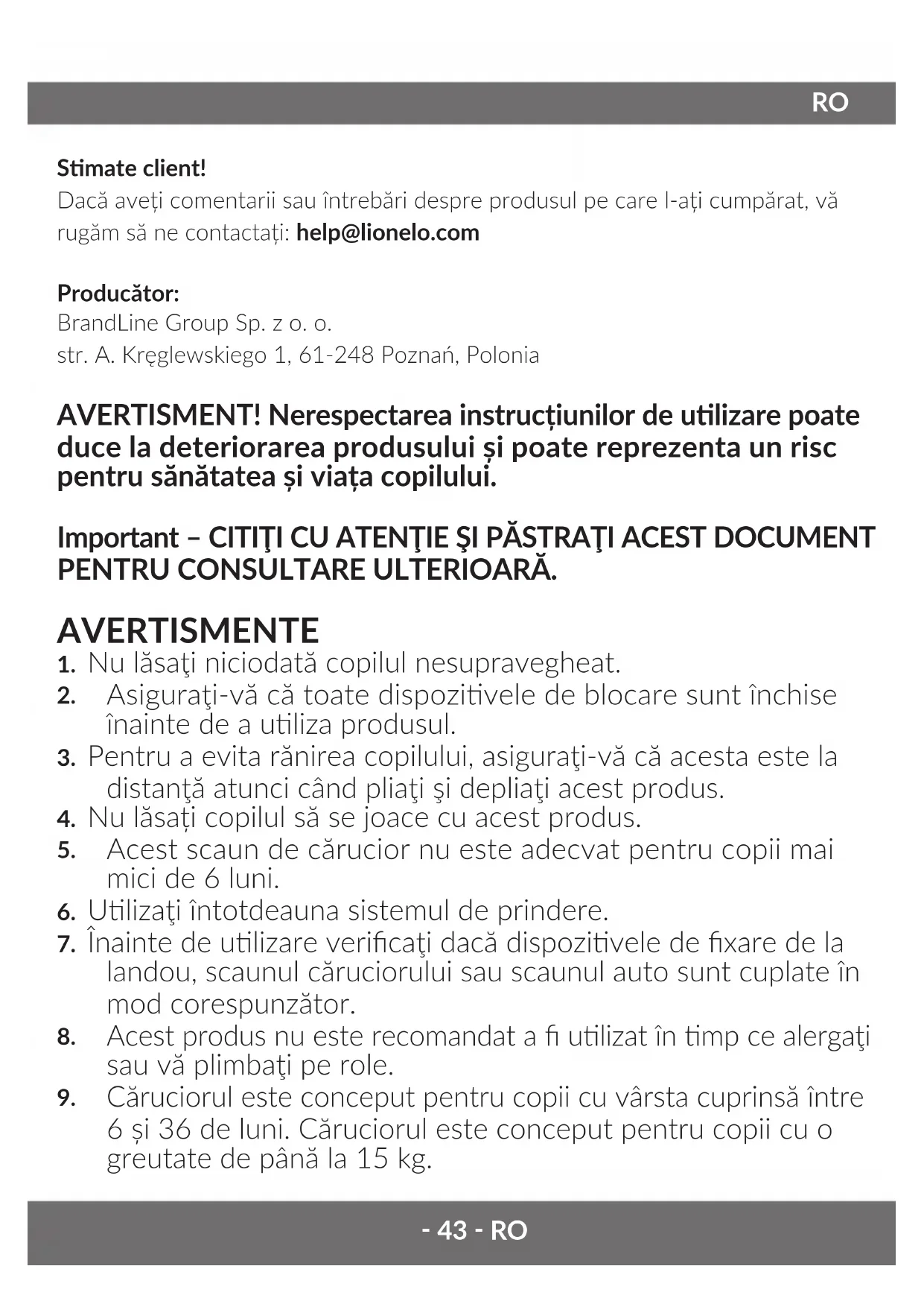 - Ne használjon erős sztószereket. A képek illusztrációk, a termék megjelenése a valóságban eltérhet a képeken láthatótól.‑ 43 ‑ RO Smate client! Dacă aveți comentarii sau întrebări despre produsul pe care l-ați cumpărat, vă rugăm să ne contactați: help@lionelo.com Producător: BrandLine Group Sp. z o. o. str. A. Kręglewskiego 1, 61-248 Poznań, Polonia AVERTISMENT! Nerespectarea instrucțiunilor de ulizare poate duce la deteriorarea produsului și poate reprezenta un risc pentru sănătatea și viața copilului. Important – CITIŢI CU ATENŢIE ŞI PĂSTRAŢI ACEST DOCUMENT PENTRU CONSULTARE ULTERIOARĂ. AVERTISMENTE