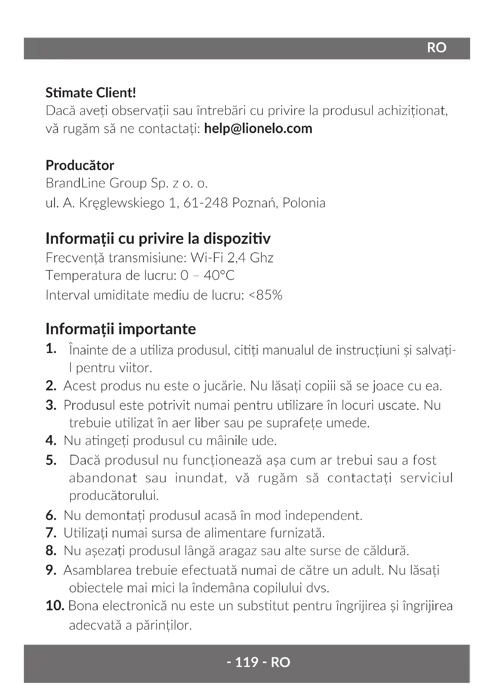 Smate Client! Dacă aveți observații sau întrebări cu privire la produsul achiziționat, vă rugăm să ne contactați: help@lionelo.com Producător BrandLine Group Sp. z o. o. ul. A. Kręglewskiego 1, 61-248 Poznań, Polonia Informații cu privire la dispoziv Frecvență transmisiune: Wi-Fi 2,4 Ghz Temperatura de lucru: 0 – 40°C Interval umiditate mediu de lucru: <85% Informații importante