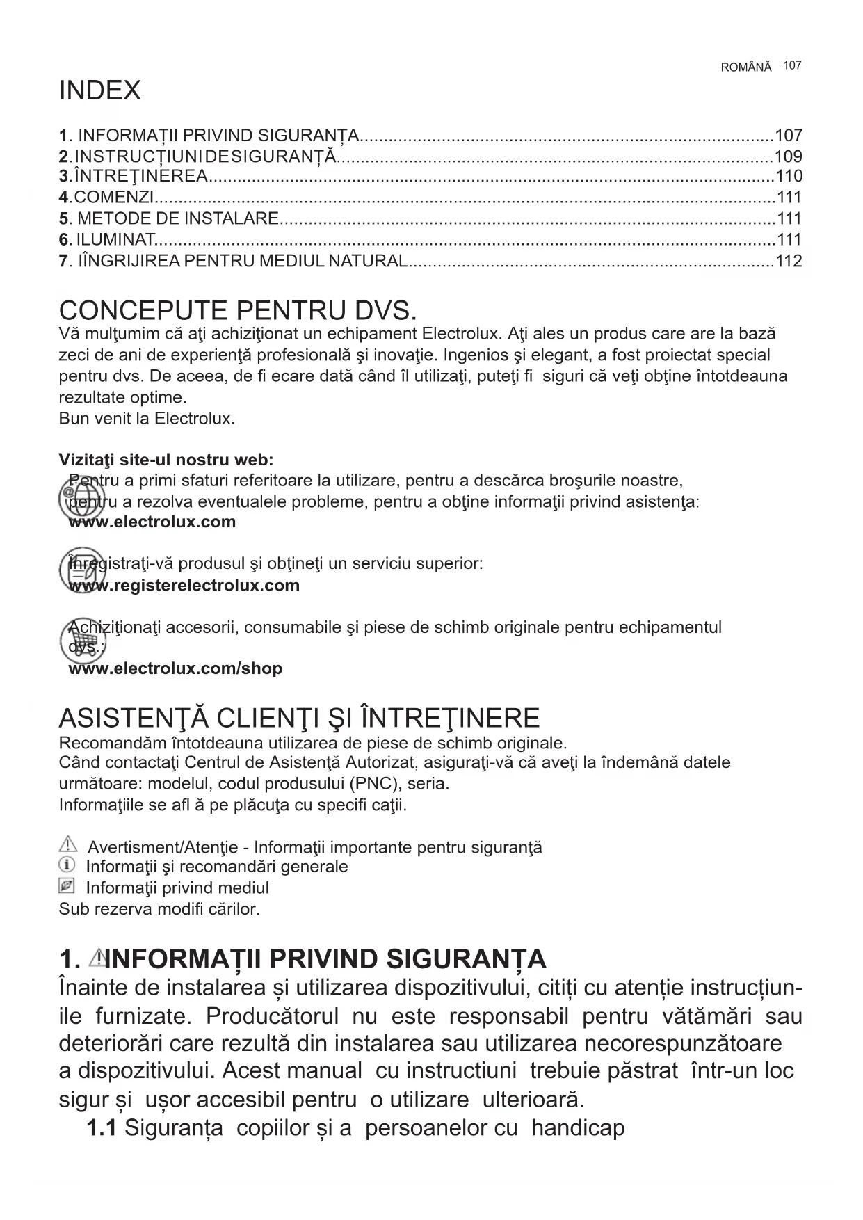 CONCEPUTE PENTRU DVS. Vă mulţumim că aţi achiziţionat un echipament Electrolux. Aţi ales un produs care are la bază zeci de ani de experienţă profesională şi inovaţie. Ingenios şi elegant, a fost proiectat special pentru dvs. De aceea, de fi ecare dată când îl utilizaţi, puteţi fi siguri că veţi obţine întotdeauna rezultate optime. Bun venit la Electrolux. Vizitaţi site-ul nostru web: Pentru a primi sfaturi referitoare la utilizare, pentru a descărca broşurile noastre, pentru a rezolva eventualele probleme, pentru a obţine informaţii privind asistenţa: www.electrolux.com Înregistraţi-vă produsul şi obţineţi un serviciu superior: www.registerelectrolux.com Achiziţionaţi accesorii, consumabile şi piese de schimb originale pentru echipamentul dvs.: www.electrolux.com/shop