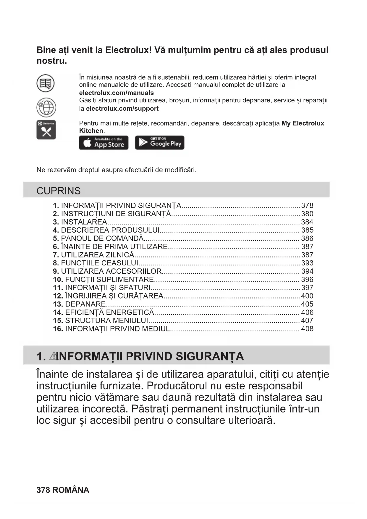 Înainte de instalarea și de utilizarea aparatului, citiți cu atenție instrucțiunile furnizate. Producătorul nu este responsabil pentru nicio vătămare sau daună rezultată din instalarea sau utilizarea incorectă. Păstrați permanent instrucțiunile într-un loc sigur și accesibil pentru o consultare ulterioară. 378 ROMÂNA1.1 Siguranța copiilor și a persoanelor vulnerabile