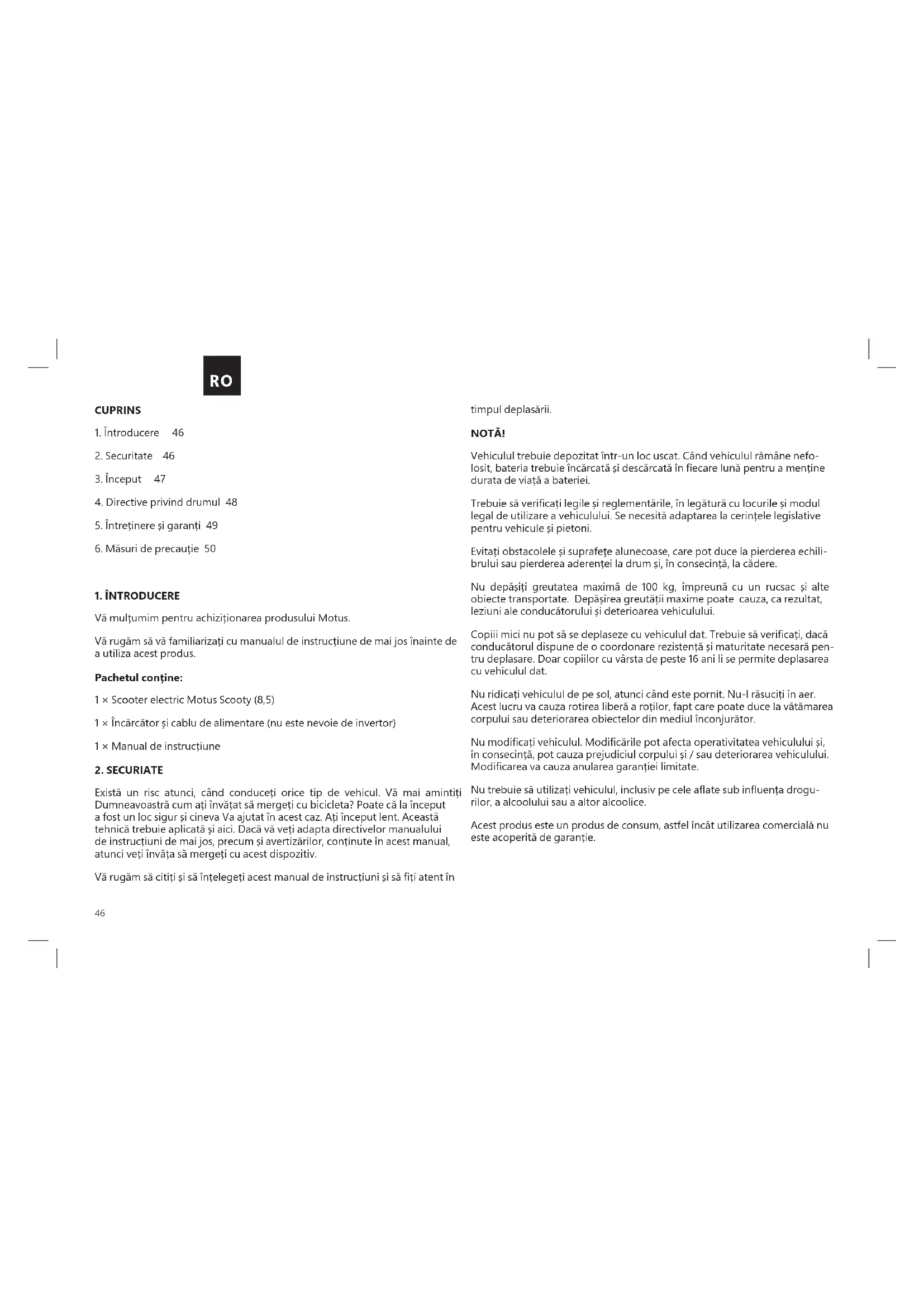 Există un risc atunci, când conduceți orice tip de vehicul. Vă mai amintiți Dumneavoastră cum ați învățat să mergeți cu bicicleta? Poate că la început a fost un loc sigur și cineva Va ajutat în acest caz. Ați început lent. Această tehnică trebuie aplicată și aici. Dacă vă veți adapta directivelor manualului de instrucțiuni de mai jos, precum și avertizărilor, conținute în acest manual, atunci veți învăța să mergeți cu acest dispozitiv. Vă rugăm să citiți și să înțelegeți acest manual de instrucțiuni și să ți atent în timpul deplasării. NOTĂ! Vehiculul trebuie depozitat într-un loc uscat. Când vehiculul rămâne nefo- losit, bateria trebuie încărcată și descărcată în ecare lună pentru a menține durata de viață a bateriei. Trebuie să vericați legile și reglementările, în legătură cu locurile și modul legal de utilizare a vehiculului. Se necesită adaptarea la cerințele legislative pentru vehicule și pietoni. Evitați obstacolele și suprafețe alunecoase, care pot duce la pierderea echili- brului sau pierderea aderenței la drum și, în consecință, la cădere. Nu depășiți greutatea maximă de 100 kg, împreună cu un rucsac și alte obiecte transportate. Depășirea greutății maxime poate cauza, ca rezultat, leziuni ale conducătorului și deterioarea vehiculului. Copiii mici nu pot să se deplaseze cu vehiculul dat. Trebuie să vericați, dacă conducătorul dispune de o coordonare rezistență și maturitate necesară pen- tru deplasare. Doar copiilor cu vârsta de peste 16 ani li se permite deplasarea cu vehiculul dat. Nu ridicați vehiculul de pe sol, atunci când este pornit. Nu-l răsuciți în aer. Acest lucru va cauza rotirea liberă a roților, fapt care poate duce la vătămarea corpului sau deteriorarea obiectelor din mediul înconjurător. Nu modicați vehiculul. Modicările pot afecta operativitatea vehiculului și, în consecință, pot cauza prejudiciul corpului și / sau deteriorarea vehiculului. Modicarea va cauza anularea garanției limitate. Nu trebuie să utilizați vehiculul, inclusiv pe cele aate sub inuența drogu- rilor, a alcoolului sau a altor alcoolice. Acest produs este un produs de consum, astfel încât utilizarea comercială nu este acoperită de garanție. RO47