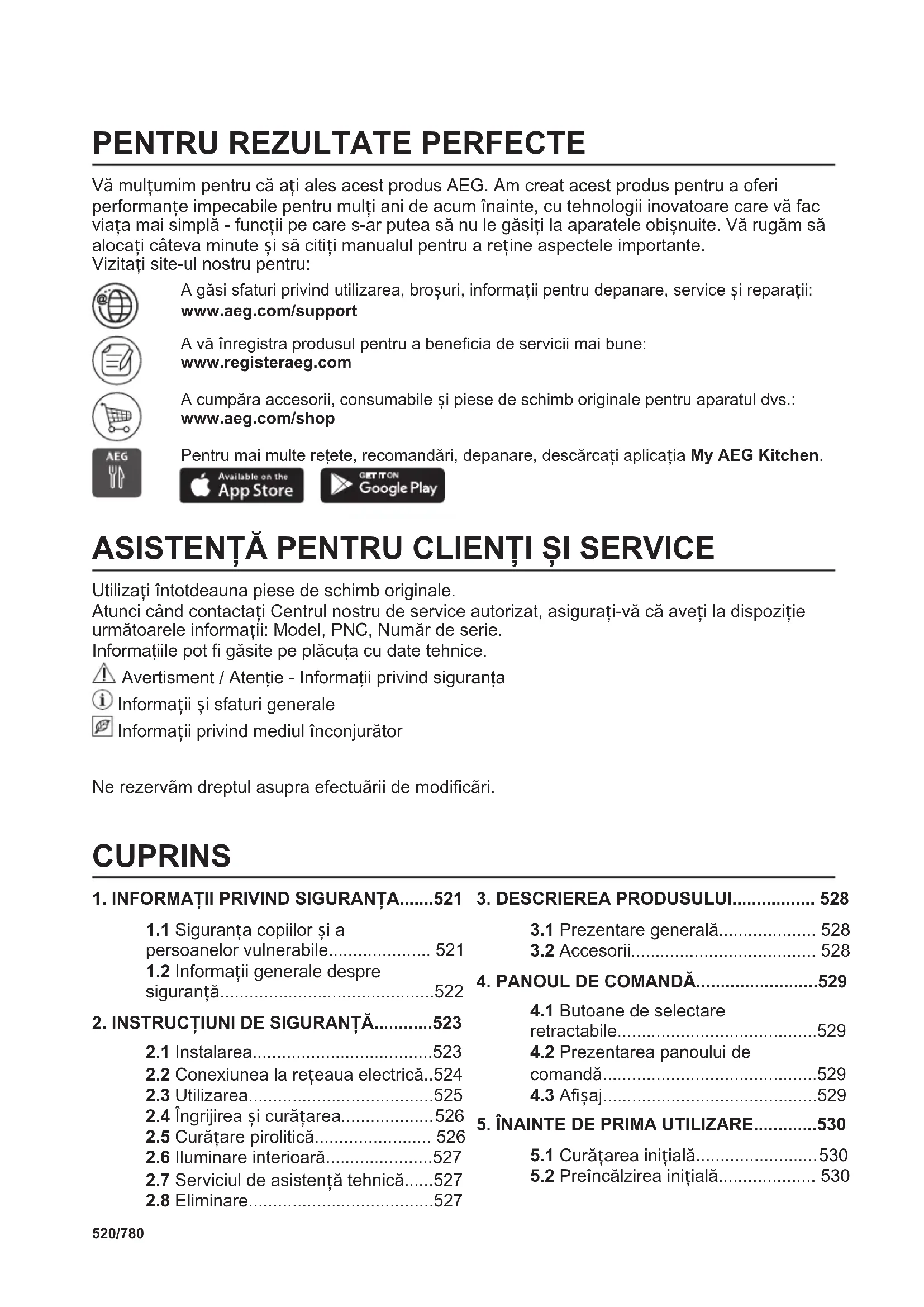 Vă mulțumim pentru că ați ales acest produs AEG. Am creat acest produs pentru a oferi performanțe impecabile pentru mulți ani de acum înainte, cu tehnologii inovatoare care vă fac viața mai simplă - funcții pe care s-ar putea să nu le găsiți la aparatele obișnuite. Vă rugăm să alocați câteva minute și să citiți manualul pentru a reține aspectele importante. Vizitați site-ul nostru pentru: A găsi sfaturi privind utilizarea, broșuri, informații pentru depanare, service și reparații: www.aeg.com/support A vă înregistra produsul pentru a beneficia de servicii mai bune: www.registeraeg.com A cumpăra accesorii, consumabile și piese de schimb originale pentru aparatul dvs.: www.aeg.com/shop Pentru mai multe reţete, recomandări, depanare, descărcați aplicația My AEG Kitchen.