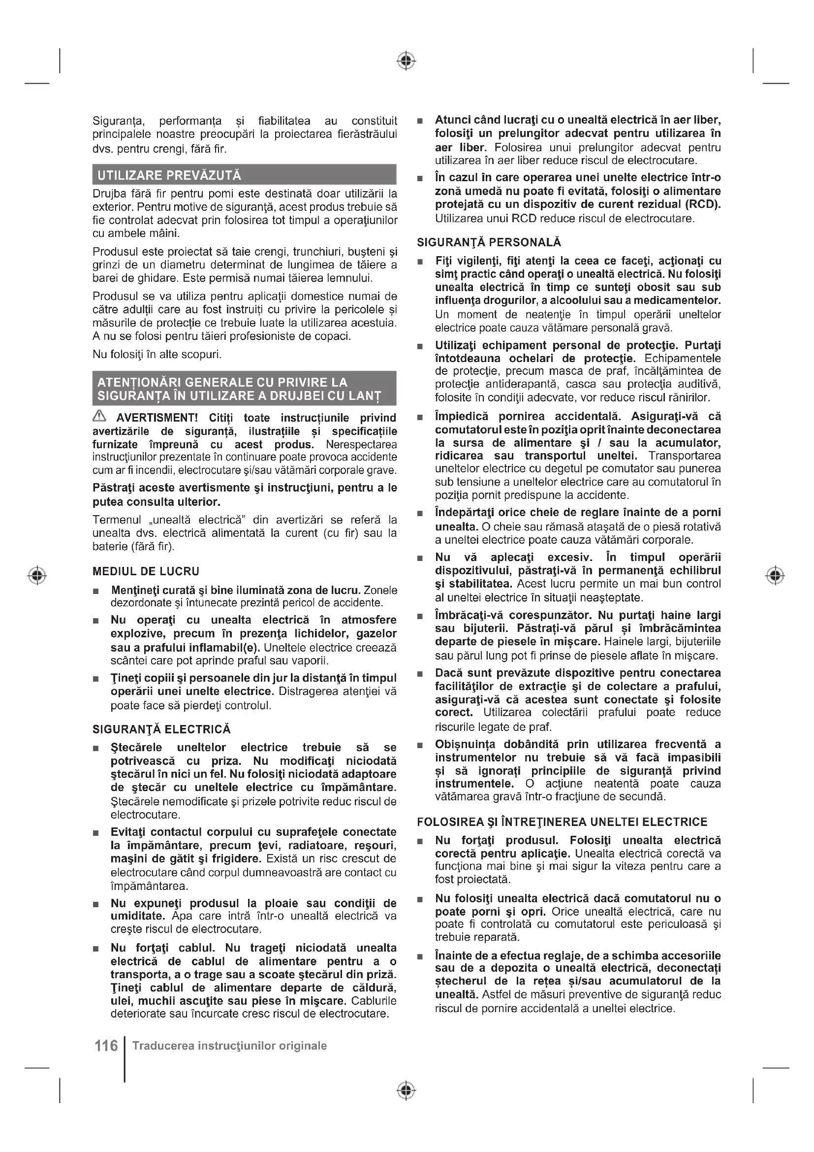 Drujba fără fi r pentru pomi este destinată doar utilizării la exterior. Pentru motive de siguranţă, acest produs trebuie să fi e controlat adecvat prin folosirea tot timpul a operaţiunilor cu ambele mâini. Produsul este proiectat să taie crengi, trunchiuri, buşteni şi grinzi de un diametru determinat de lungimea de tăiere a barei de ghidare. Este permisă numai tăierea lemnului. Produsul se va utiliza pentru aplicații domestice numai de către adulții care au fost instruiți cu privire la pericolele și măsurile de protecție ce trebuie luate la utilizarea acestuia. A nu se folosi pentru tăieri profesioniste de copaci. Nu folosiţi în alte scopuri. ATENȚIONĂRI GENERALE CU PRIVIRE LA SIGURANȚA ÎN UTILIZARE A DRUJBEI CU LANȚ AVERTISMENT! Citiți toate instrucțiunile privind avertizările de siguranță, ilustrațiile și specificațiile furnizate împreună cu acest produs. Nerespectarea instrucţiunilor prezentate în continuare poate provoca accidente cum ar fi incendii, electrocutare şi/sau vătămări corporale grave. Păstraţi aceste avertismente şi instrucţiuni, pentru a le putea consulta ulterior. Termenul „unealtă electrică” din avertizări se referă la unealta dvs. electrică alimentată la curent (cu fi r) sau la baterie (fără fi r).