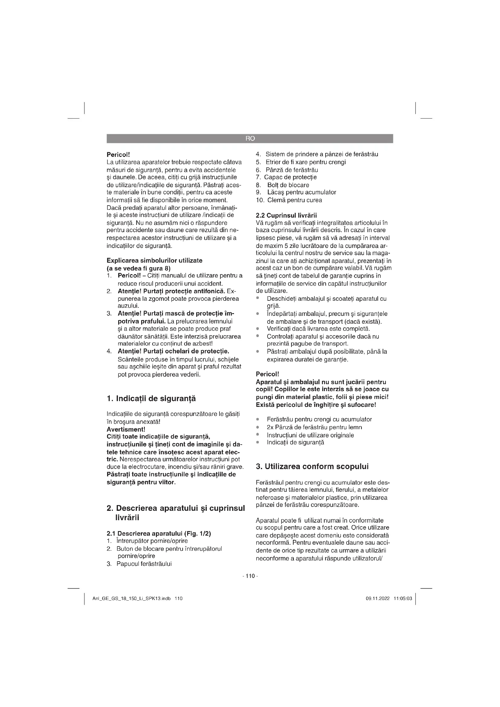 Ferăstrăul pentru crengi cu acumulator este des- tinat pentru tăierea lemnului, fi erului, a metalelor neferoase şi materialelor plastice, prin utilizarea pânzei de ferăstrău corespunzătoare. Aparatul poate fi utilizat numai în conformitate cu scopul pentru care a fost creat. Orice utilizare care depăşeşte acest domeniu este considerată neconformă. Pentru eventualele daune sau acci- dente de orice tip rezultate ca urmare a utilizării neconforme a aparatului răspunde utilizatorul/ Anl_GE_GS_18_150_Li_SPK13.indb 110Anl_GE_GS_18_150_Li_SPK13.indb 110 09.11.2022 11:05:0309.11.2022 11:05:03RO