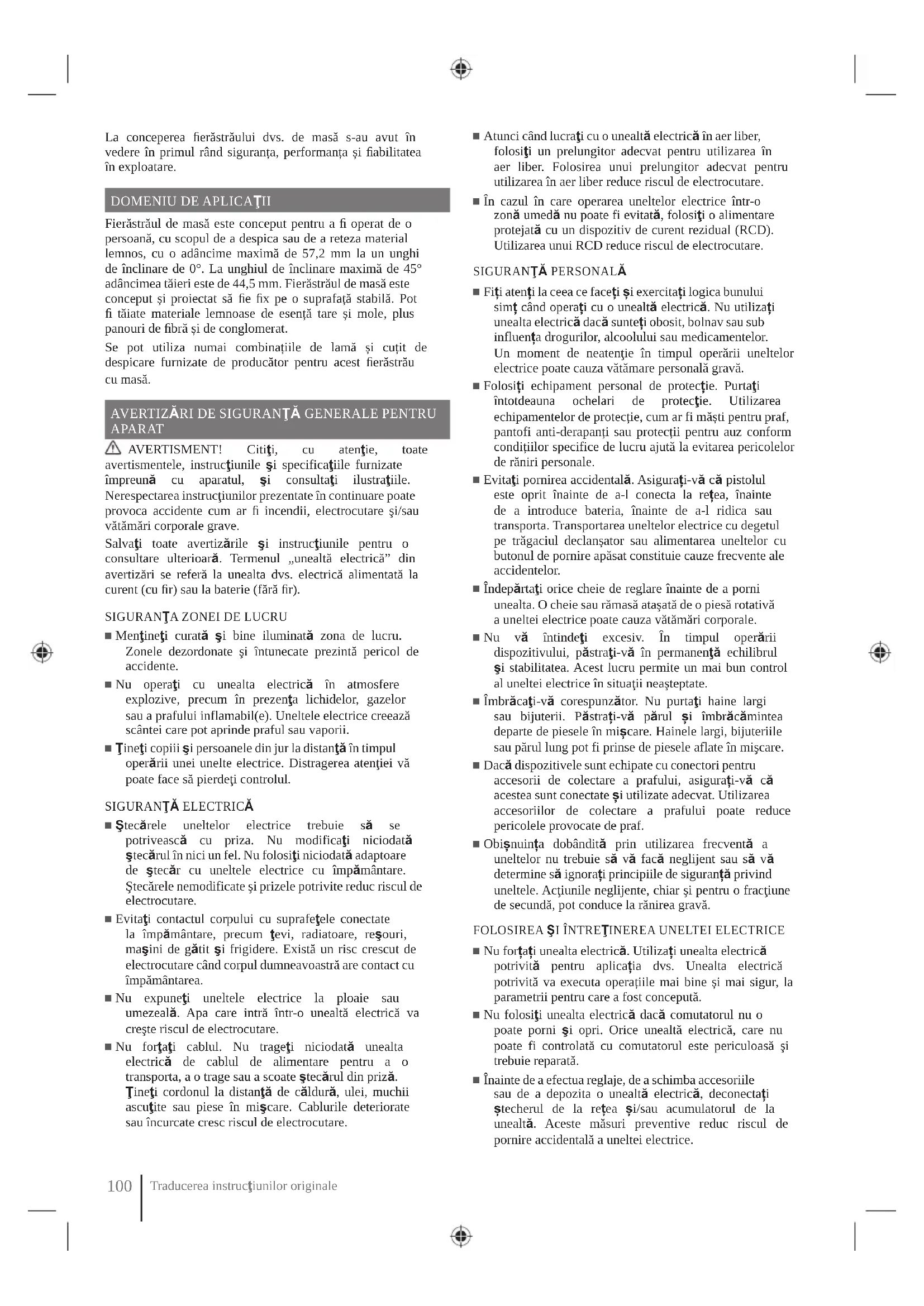 Fierăstrăul de masă este conceput pentru a fi operat de o persoană, cu scopul de a despica sau de a reteza material lemnos, cu o adâncime maximă de 57,2 mm la un unghi de înclinare de 0°. La unghiul de înclinare maximă de 45° adâncimea tăieri este de 44,5 mm. Fierăstrăul de masă este conceput și proiectat să fi e fi x pe o suprafață stabilă. Pot fi tăiate materiale lemnoase de esență tare și mole, plus panouri de fi bră și de conglomerat. Se pot utiliza numai combinațiile de lamă și cuțit de despicare furnizate de producător pentru acest fi erăstrău cu masă.