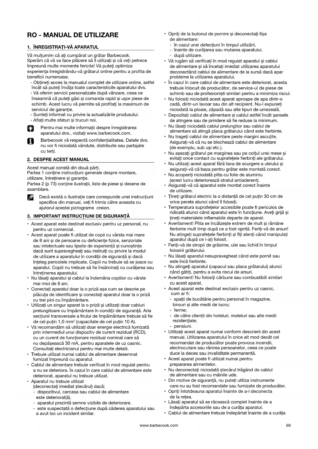 Vă mulțumim că ați cumpărat un grătar Barbecook. Sperăm că vă va face plăcere să îl utilizați și că veți petrece împreună multe momente fericite! Vă puteți optimiza experiența înregistrându-vă grătarul online pentru a prota de benecii numeroase. - Obțineți acces la manualul complet de utilizare online, astfel încât să puteți învăța toate caracteristicile aparatului dvs. - Vă oferim servicii personalizate după vânzare, ceea ce înseamnă că puteți găsi și comanda rapid și ușor piese de schimb. Acest lucru vă permite să protați la maximum de serviciul de garanție. - Sunteți informat cu privire la actualizările produsului. - Aați multe sfaturi și trucuri noi. Pentru mai multe informații despre înregistrarea aparatului dvs., vizitați www.barbecook.com. Barbecook vă respectă condențialitatea. Datele dvs. nu vor niciodată vândute, distribuite sau partajate cu terți.