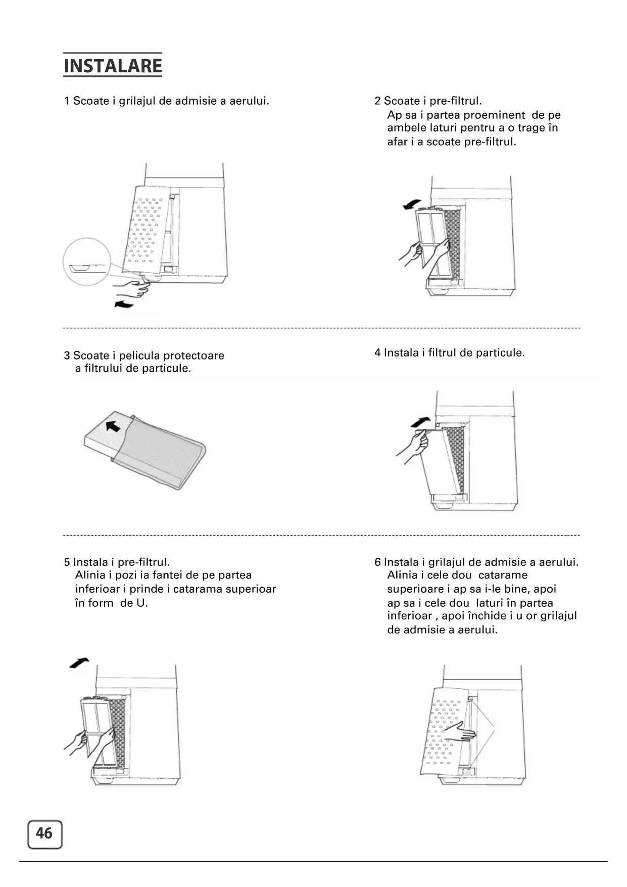 DESCRIERE46 INSTALARE 1 Scoateți grilajul de admisie a aerului. 3 Scoateți pelicula protectoare a ltrului de particule. 5 Instalați pre-ltrul. Aliniați poziția fantei de pe partea inferioar i prindeți catarama superioar în form de U. 6 Instalați grilajul de admisie a aerului. Aliniați cele dou catarame superioare i ap sați-le bine, apoi ap sați cele dou laturi în partea inferioar , apoi închideți u or grilajul de admisie a aerului. 4 Instalați ltrul de particule. 2 Scoateți pre-ltrul. Ap sați partea proeminent de pe ambele laturi pentru a o trage în afar i a scoate pre-ltrul.47