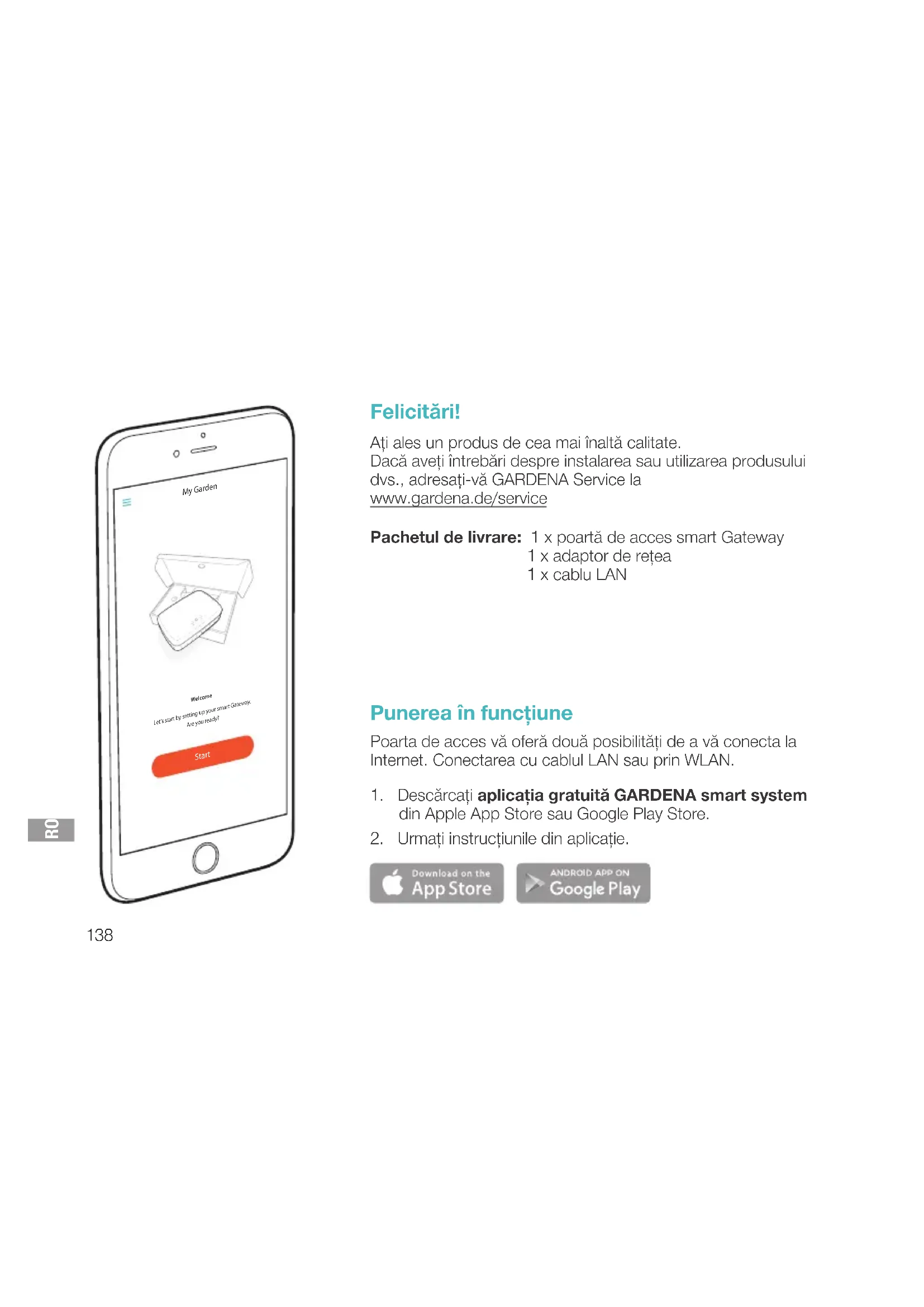 Felicitări! Aţi ales un produs de cea mai înaltă calitate. Dacă aveţi întrebări despre instalarea sau utilizarea produsului dvs., adresaţi-vă GARDENA Service la www.gardena.de/service Pachetul de livrare: 1 x poartă de acces smart Gateway 1 x adaptor de reţea 1 x cablu LAN Punerea în funcţiune Poarta de acces vă oferă două posibilităţi de a vă conecta la Internet. Conectarea cu cablul LAN sau prin WLAN.