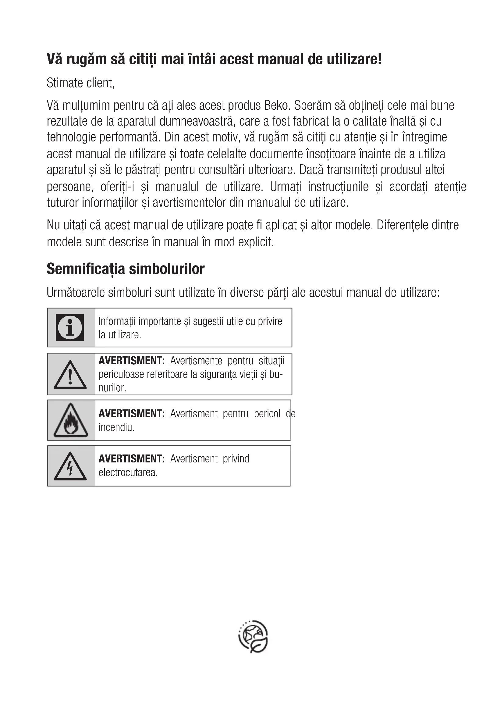 PRODUSUL NU BENEFICIAZĂ DE GARANŢIE LEGALĂ DE CONFORMITATE ÎN URMĂTOARELE CAZURI: - piesele şi accesoriile care prezintă lovituri, zgârieturi, spărturi sau deformări din vina exclusivă a consumatorului. Reclamaţiile referitoare la aspectele prevăzute mai jos, se rezolvă numai contra cost : Drepturile consumatorului sunt cele prevăzute în OUG nr. 140/2021 și OG 21/1992 (republicată). Pentru orice defecţiune aparută în perioada de garanţie legală, apelaţi la vânzător (respectiv, prin magazinul de unde a fost achiziţionat produsul sau direct prin Call Center Arctic). Prelungirea termenului de garanţie se va înscrie în certicatul de garanţie de către unitatea SERVICE care a efectuat reparaţia. Garanţia acoperă repararea şi/sau înlocuirea pieselor constatate ca neconforme în sensul OUG nr. 140/2021 (necauzate de consumator) de către tehnicienii Service Arctic. Termenul de realizare a operaţiilor de reparare, înlocuire sau întreţinere este de 15 zile calendaristice de la data la care cumpărătorul a sesizat lipsa de conformitate către vânzător (respectiv, prin magazinul de unde a achiziţionat produsul sau direct prin Call Center Arctic). Reparaţiile / înlocuirile se efectuează cu respectarea următoarelor condiţii - art. 12(1)-(5) din OUG nr. 140/2021: a) fără costuri și fără vreun inconvenient semnicativ pentru consumator, ţinând seama de natura bunurilor şi de scopul pentru care consumatorul a solicitat bunurile în cauză; b) consumatorul pune bunurile la dispoziţia vânzătorului, iar vânzătorul preia bunurile înlocuite pe propria cheltuială; c) obligaţia de a repara sau înlocui bunurile include, după caz, demontarea bunurilor neconforme şi instalarea bunurilor de înlocuire sau a bunurilor reparate sau suportarea costurilor aferente demontării şi instalării; d) consumatorul nu este obligat să plătească pentru utilizarea normală a bunurilor înlocuite în perioada care a precedat înlocuirea acestora. CONDIŢII SUPLIMENTARE DE GARANŢIE LEGALĂ DE CONFORMITATE: În cadrul acestui proces, Arctic vă prelucrează date cu caracter personal, cu respectarea legilor aplicabile privind condenţialitatea și protecţia datelor. Pentru informaţii complete despre modul în care vă prelucrăm datele, precum și despre drepturile dumneavoastră, vă rugăm să consultaţi secţiunea “Protecţia datelor personale”, accesând site-ul nostru la adresa https://www.beko.ro/.Leia este manual do utilizador em primeiro lugar! Prezado Cliente, Obrigado por preferir este aparelho da Beko. Esperamos que obtenha os melhores resultados com o nosso aparelho, que foi fabricado com tecnologia avançada e de alta qualidade. Como tal, leia com atenção todo este manual do utilizador e os outros documentos que o acompanham antes de utilizar o aparelho e guarde-o como referência para uso futuro. Se passar o aparelho para outra pessoa, dê-lhe também este manual do utilizador. Siga as instruções estando atento às informações e avisos no manual do utilizador. Lembre-se que este manual do utilizador também pode aplicar-se a outros modelos. As diferenças entre modelos são explicitamente descritas no manual. Significados dos símbolos Os seguintes símbolos são usados em várias secções deste manual: