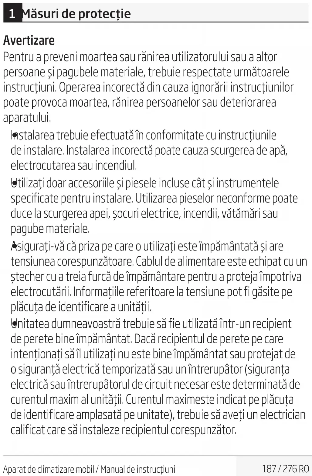Acest aparat poate fi utilizat de copiii cu vârsta de peste 8 ani doar în cazul când li se asigură supraveghere sau primesc instrucţiuni pentru utilizarea aparatului şi informaţii asupra riscurilor implicate. Curăţarea şi lucrările de întreţinere nu trebuie făcute de copii decât dacă au vârsta de peste 8 ani şi sunt supravegheaţi. Nu lăsaţi aparatul şi cablul acestuia la îndemâna copiilor cu vârsta mai mică de 8 ani. (aplicabil în statele membre ale Uniunii Europene) 1 Măsuri de protecţie190 / 276 RO Aparat de climatizare mobil / Manual de instrucţiuni