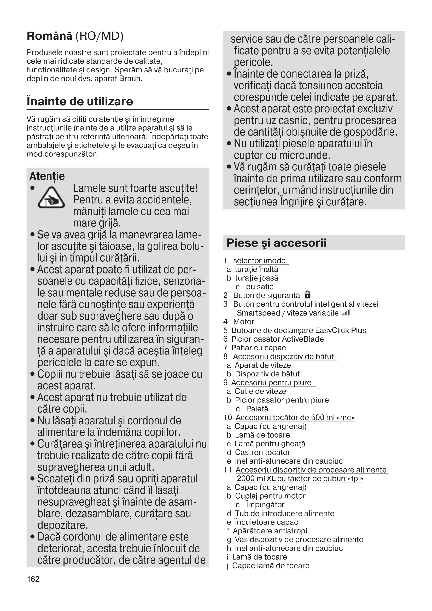 Vă rugăm să curăţaţi toate piesele înainte de prima utilizare sau conform cerinţelor, urmând instrucţiunile din secţiunea Îngrijire şi curăţare. Piese şi accesorii 1 selector imode a turaţie înaltă b turaţie joasă c pulsaţie 2 Buton de siguranţă 3 Buton pentru controlul inteligent al vitezei Smartspeed / viteze variabile 4 Motor 5 Butoane de declanşare EasyClick Plus 6 Picior pasator ActiveBlade 7 Pahar cu capac 8 Accesoriu dispozitiv de bătut a Aparat de viteze b Dispozitiv de bătut 9 Accesoriu pentru piure a Cutie de viteze b Picior pasator pentru piure c Paletă 10 Accesoriu tocător de 500 ml «mc» a Capac (cu angrenaj) b Lamă de tocare c Lamă pentru gheaţă d Castron tocător e Inel anti-alunecare din cauciuc 11 Accesoriu dispozitiv de procesare alimente 2000 ml XL cu tăietor de cuburi «fpl» a Capac (cu angrenaj) b Cuplaj pentru motor c Împingător d Tub de introducere alimente e Încuietoare capac f Apărătoare antistropi g Vas dispozitiv de procesare alimente h Inel anti-alunecare din cauciuc i Lamă de tocare j Capac lamă de tocare 5722112384_HB901-MQ91-75-87-95 INT.indd 162 01.07.20 13:47163 k Unealtă pentru aluat (FP) l Cârlig de frământare (tăietor de cuburi) m Lamă tăietor de cuburi n Bază tăietor de cuburi o Împingător curăţare p Suport inserţii (i) Inserţie de feliere (subţire, gros) (ii) Inserţii de tocare (subţire, gros) (iii) Inserţie pentru tăiere Julienne q Disc pentru cartofi prăjiţi r Ax disc 12 Stativ pentru depozitare Cum se utilizează aparatul 3 Butonul pentru controlul inteligent al vitezei pentru viteze variabile O apăsare, toate vitezele. Cu cât apăsaţi mai mult, cu atât viteza va fi mai mare. Cu cât viteza este mai mare, cu atât mai repede şi mai subţire va amesteca şi va toca aparatul. Operaţiune pentru o singură mână: butonul pentru controlul inteligent al vitezei Smartspeed (3) vă permite să porniţi aparatul şi să controlaţi viteza cu o singură mână. Utilizarea blenderului dvs. de mână Prima utilizare: Îndepărtaţi dispozitivul de blocare pentru transport de pe motor (4) trăgând de banda roşie. Pornirea (A) Aparatul este echipat cu un selector imode (1) şi un buton de siguranţă (2) pentru eliberarea comutatorului Smartspeed (3). Vă rugăm să respectaţi instrucţiunile pentru pornirea aparatului: