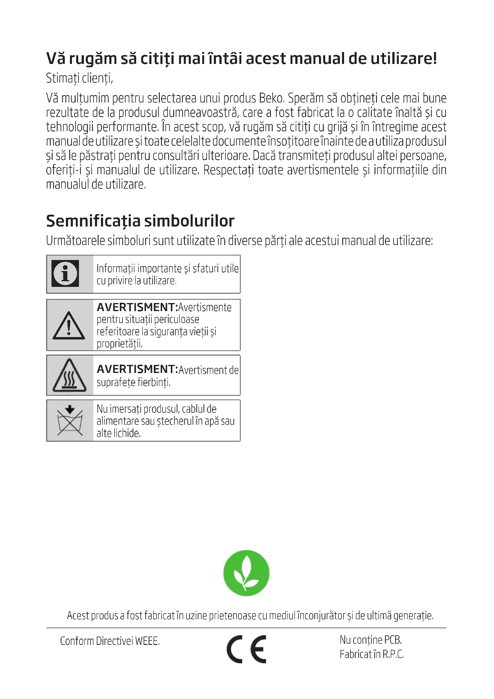 - Produsele noastre BEKO sunt corespunzătoare cu standardele de siguranță aplicabile; dacă produsul sau cablul de alimentare este avariat, acesta trebuie să fie reparat sau înlocuit de către un centru de service pentru evitarea oricărui pericol. Lucrările de reparații defectoase sau necalificate pot cauza pericol și riscuri utilizatorului.