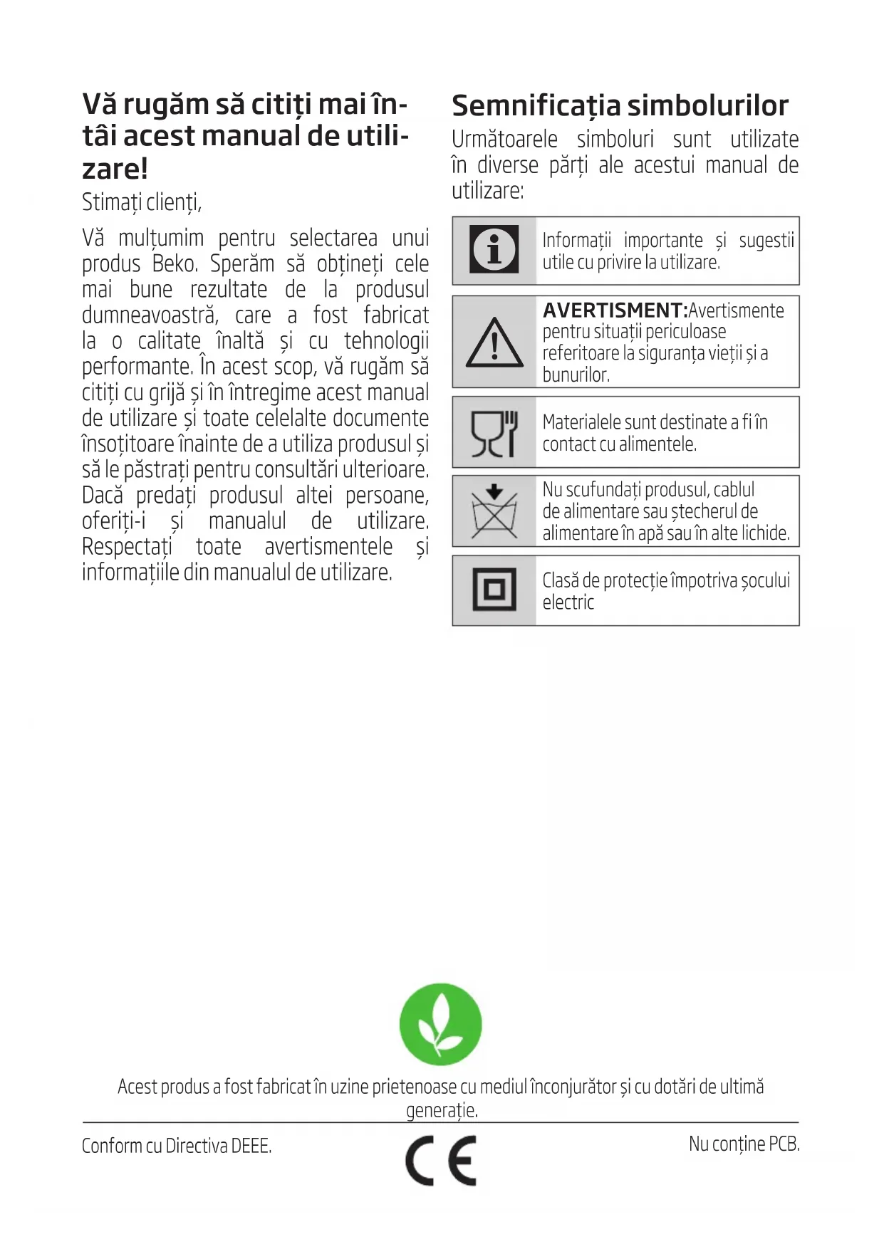 Prima di contattare l’assistenza tecnica, al ne di agevolare la gestione della chiamata, è necessario avere a portata di mano il modello del prodotto e il documento scale di acquisto.Vărugămsăcitițimaiîn- tâiacestmanualdeutili- zare! Stimați clienți, Vă mulțumim pentru selectarea unui produs Beko. Sperăm să obţineţi cele mai bune rezultate de la produsul dumneavoastră, care a fost fabricat la o calitate înaltă şi cu tehnologii performante. În acest scop, vă rugăm să citiți cu grijă şi în întregime acest manual de utilizare şi toate celelalte documente însoțitoare înainte de a utiliza produsul şi să le păstrați pentru consultări ulterioare. Dacă predați produsul altei persoane, oferiți-i şi manualul de utilizare. Respectați toate avertismentele şi informațiile din manualul de utilizare. Acest produs a fost fabricat în uzine prietenoase cu mediul înconjurător şi cu dotări de ultimă generație. Conform cu Directiva DEEE. Nu conţine PCB. Semnificațiasimbolurilor Următoarele simboluri sunt utilizate în diverse părți ale acestui manual de utilizare: