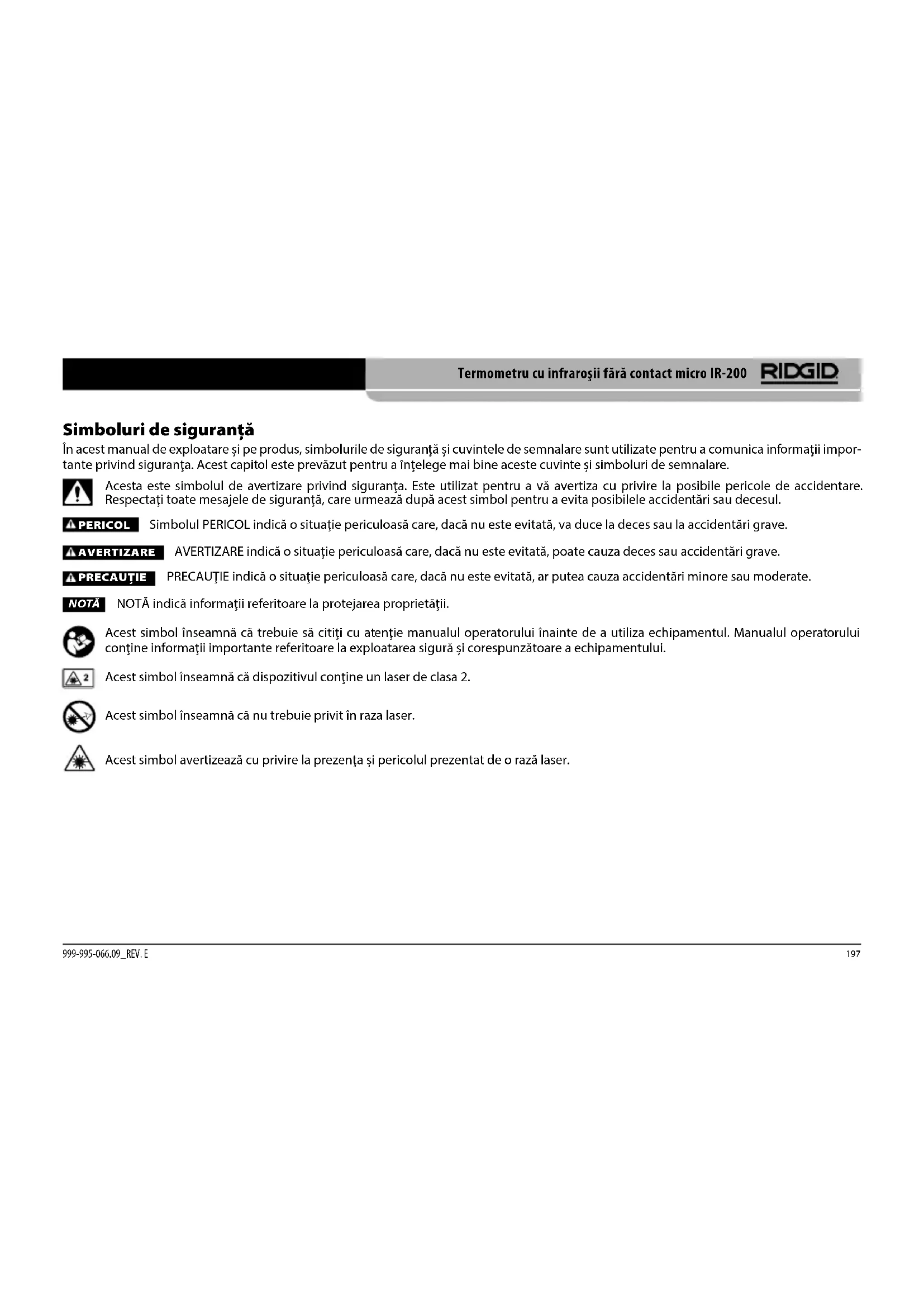 Simboluri de siguranţă În acest manual de exploatare şi pe produs, simbolurile de siguranţă şi cuvintele de semnalare sunt utilizate pentru a comunica informaţii impor- tante privind siguranţa. Acest capitol este prevăzut pentru a înţelege mai bine aceste cuvinte şi simboluri de semnalare. PERICOL Acesta este simbolul de avertizare privind siguranţa. Este utilizat pentru a vă avertiza cu privire la posibile pericole de accidentare. Respectaţi toate mesajele de siguranţă, care urmează după acest simbol pentru a evita posibilele accidentări sau decesul. Simbolul PERICOL indică o situaţie periculoasă care, dacă nu este evitată, va duce la deces sau la accidentări grave. AVERTIZARE indică o situaţie periculoasă care, dacă nu este evitată, poate cauza deces sau accidentări grave. PRECAUŢIE indică o situaţie periculoasă care, dacă nu este evitată, ar putea cauza accidentări minore sau moderate. NOTĂ indică informaţii referitoare la protejarea proprietăţii. Acest simbol înseamnă că trebuie să citiţi cu atenţie manualul operatorului înainte de a utiliza echipamentul. Manualul operatorului conţine informaţii importante referitoare la exploatarea sigură şi corespunzătoare a echipamentului. NOTĂ AVERTIZARE Acest simbol înseamnă că dispozitivul conţine un laser de clasa 2. Acest simbol înseamnă că nu trebuie privit în raza laser. Acest simbol avertizează cu privire la prezenţa şi pericolul prezentat de o rază laser. PRECAUŢIE198 Termometru cu infraroşii fără contact micro IR-200
