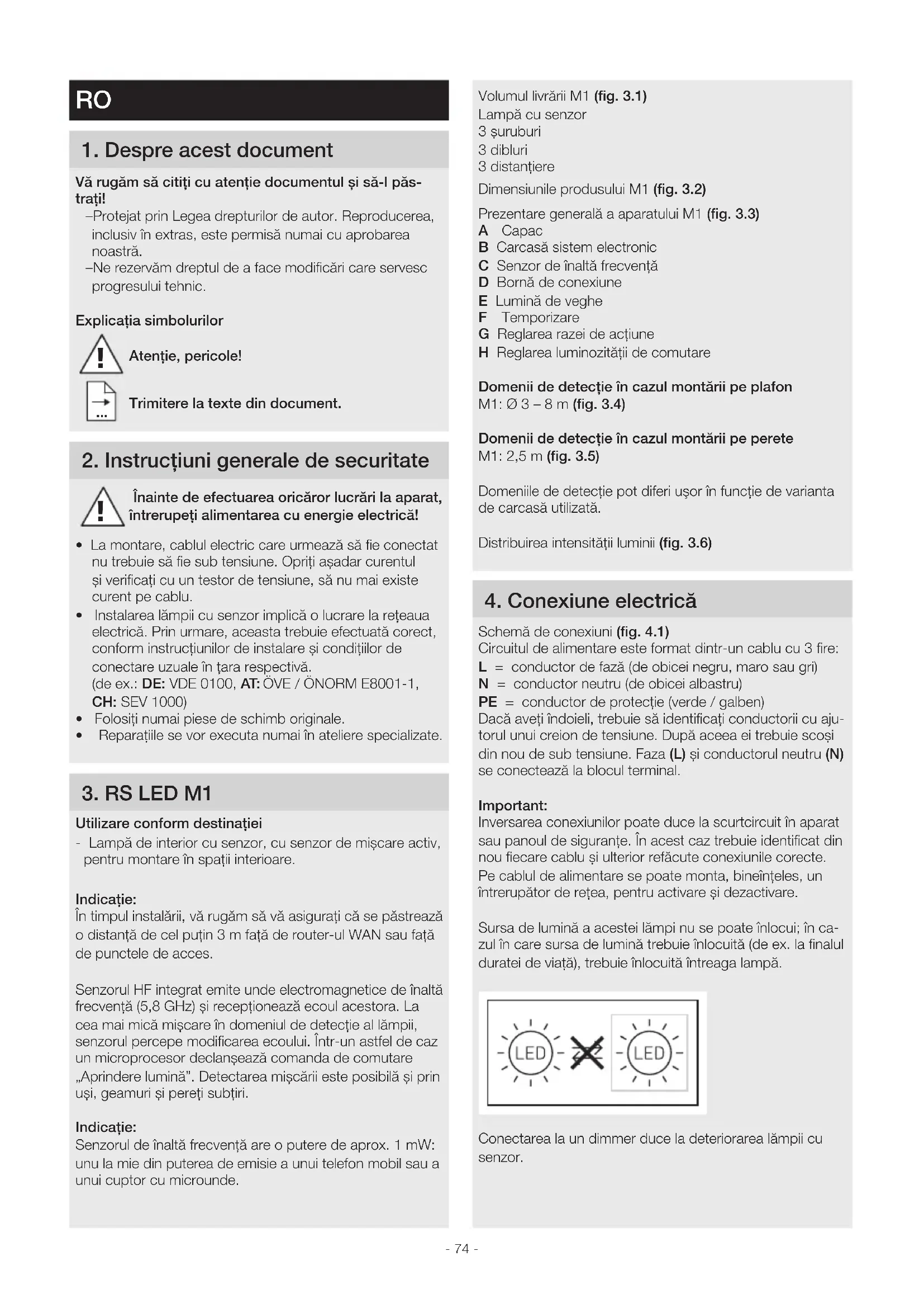 Utilizare conform destinaţiei - Lampă de interior cu senzor, cu senzor de mișcare activ, pentru montare în spaţii interioare. Indicație: În timpul instalării, vă rugăm să vă asigurați că se păstrează o distanță de cel puțin 3 m față de router-ul WAN sau față de punctele de acces. Senzorul HF integrat emite unde electromagnetice de înaltă frecvenţă (5,8 GHz) și recepţionează ecoul acestora. La cea mai mică mișcare în domeniul de detecţie al lămpii, senzorul percepe modificarea ecoului. Într-un astfel de caz un microprocesor declanșează comanda de comutare „Aprindere lumină”. Detectarea mișcării este posibilă și prin uși, geamuri și pereţi subţiri. Indicaţie: Senzorul de înaltă frecvenţă are o putere de aprox. 1 mW: unu la mie din puterea de emisie a unui telefon mobil sau a unui cuptor cu microunde. !- 75 -