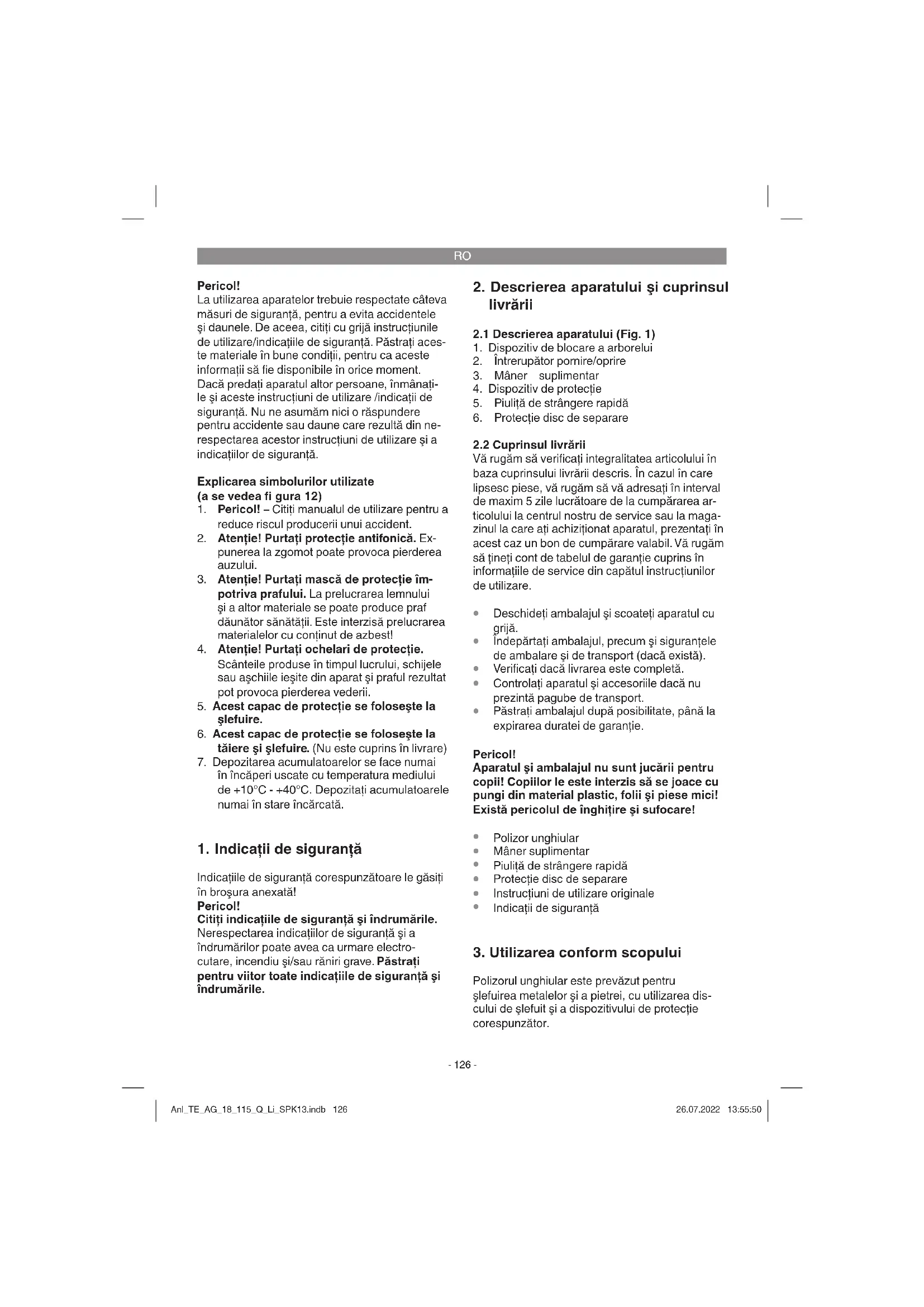 Polizorul unghiular este prevăzut pentru şlefuirea metalelor şi a pietrei, cu utilizarea dis- cului de şlefuit şi a dispozitivului de protecţie corespunzător. Anl_TE_AG_18_115_Q_Li_SPK13.indb 126Anl_TE_AG_18_115_Q_Li_SPK13.indb 126 26.07.2022 13:55:5026.07.2022 13:55:50RO
