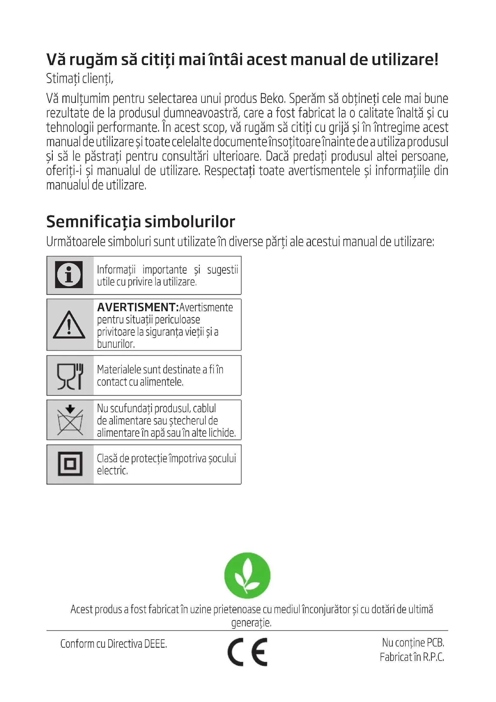 Prima di contattare l’assistenza tecnica, al ne di agevolare la gestione della chiamata, è necessario avere a portata di mano il modello del prodotto e il documento scale di acquisto.Vă rugăm să citiți mai întâi acest manual de utilizare! Stimați clienți, Vă mulțumim pentru selectarea unui produs Beko. Sperăm să obţineţi cele mai bune rezultate de la produsul dumneavoastră, care a fost fabricat la o calitate înaltă şi cu tehnologii performante. În acest scop, vă rugăm să citiți cu grijă şi în întregime acest manual de utilizare şi toate celelalte documente însoțitoare înainte de a utiliza produsul şi să le păstrați pentru consultări ulterioare. Dacă predați produsul altei persoane, oferiți-i şi manualul de utilizare. Respectați toate avertismentele şi informațiile din manualul de utilizare. Semnificația simbolurilor Următoarele simboluri sunt utilizate în diverse părți ale acestui manual de utilizare: