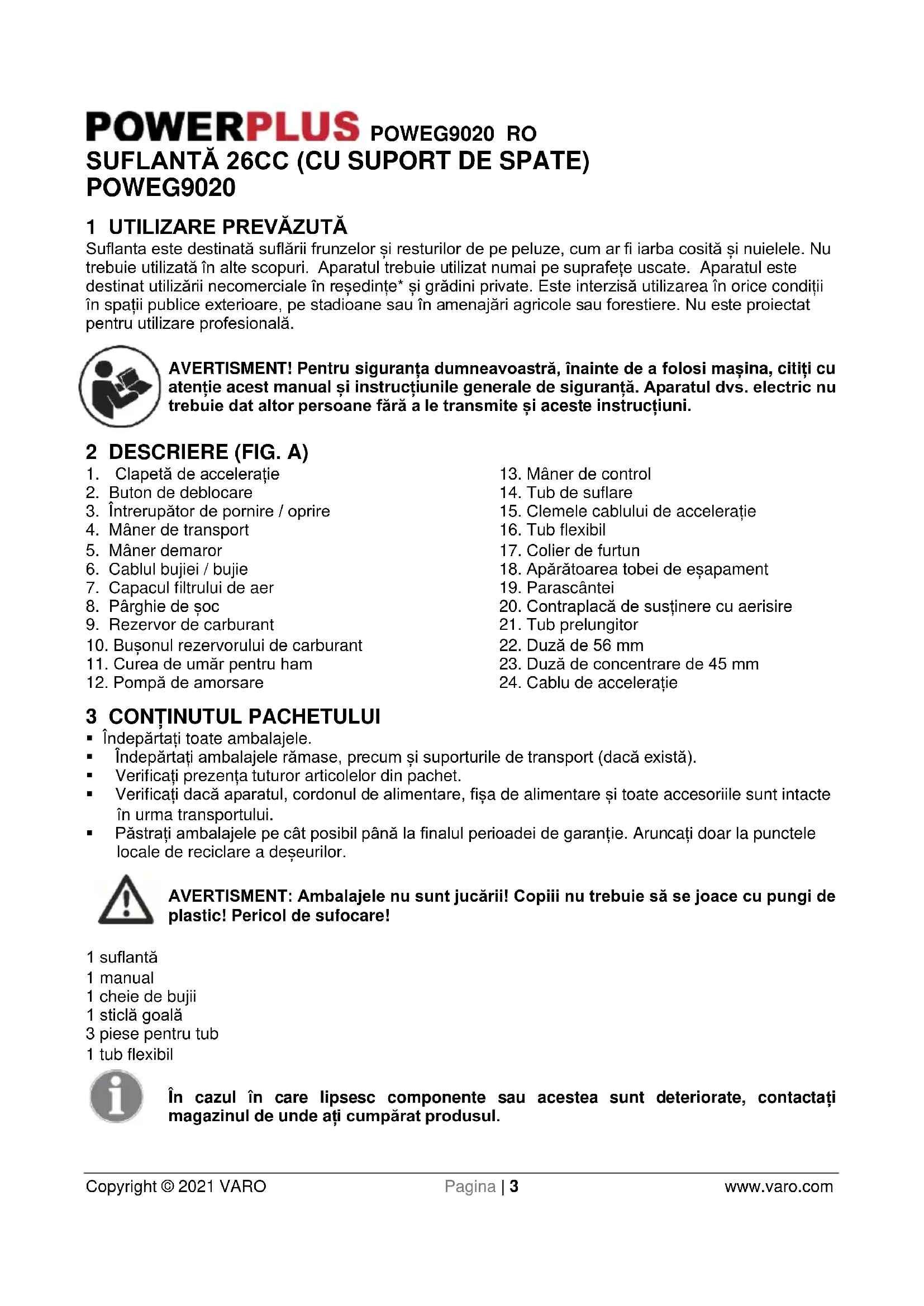 - VARO – Vic. Van Rompuy N.V. - Joseph Van Instraat 9 - BE2500 Lier - BELGIA, declară că produsul: Suflantă 26 cc (cu suport de spate) marcă de comerț: PowerPlus model: POWEG9020 este în conformitate cu specificațiile esențiale și alte prevederi relevante ale Directivelor Europene aplicabile, pe baza aplicării standardelor europene armonizate. Orice modificare neautorizată a aparatelor atrage după sine anularea acestei declarații. Directivele europene (inclusiv, dacă este cazul, amendamentele lor, până la data semnăturii): 2006/42/EC 2014/30/EU 2000/14/EC Anex V LwA Measured 106dB(A) Guaranteed 107dB(A) Standardele europene armonizate (inclusiv, dacă este cazul, amendamentele lor, până la data semnăturii): EN15503 : 2009 – A2 EN ISO 14982 : 2009 Persoana care păstrează documentația tehnică: Philippe Vankerkhove, VARO – Vic. Van Rompuy N.V. Subsemnatul acționează în numele Directorului general executiv al societății, Philippe Vankerkhove Divizia de reglementare – Director de conformitate 02/08/21, Lier – BelgiumPOWEG9020 BG Copyright © 2021 VARO с т р а н и ц а | 1 www.varo.com 1 ПРЕДНАЗНАЧЕНИЕ НА УПОТРЕБАТА p. 3