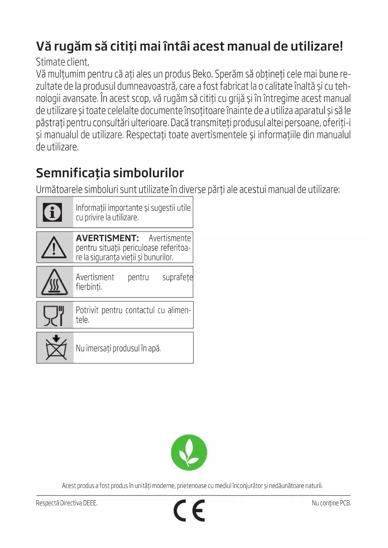 - Toute chute de l’appareil peut le rendre non opérationnel ou l’endommager de façon perma- nente.Vă rugăm să citiți mai întâi acest manual de utilizare! Stimate client, Vă mulțumim pentru că ați ales un produs Beko. Sperăm să obțineți cele mai bune re- zultate de la produsul dumneavoastră, care a fost fabricat la o calitate înaltă și cu teh- nologii avansate. În acest scop, vă rugăm să citiți cu grijă și în întregime acest manual de utilizare și toate celelalte documente însoțitoare înainte de a utiliza aparatul și să le păstrați pentru consultări ulterioare. Dacă transmiteți produsul altei persoane, oferiți-i și manualul de utilizare. Respectați toate avertismentele și informațiile din manualul de utilizare. Semnificația simbolurilor Următoarele simboluri sunt utilizate în diverse părţi ale acestui manual de utilizare: