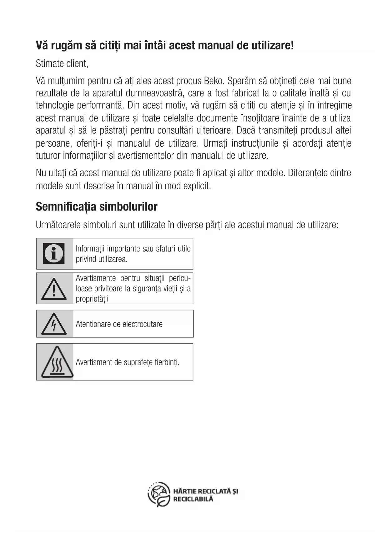 Niniejsze warunki gwarancji mają zastosowanie do Urządzeń zakupionych od dnia 01.03.2021 r. Gwarant oświadcza, że niniejsza Gwarancja jest udzielana Użytkownikowi dodatkowo i nie wyłącza, nie ogranicza ani nie zawiesza uprawnień Użytkownika wynikających z przepisów o rękojmi za wady rzeczy sprzedanej na podstawie Kodeksu cywilnego.Vă rugăm să citiți mai întâi acest manual de utilizare! Stimate client, Vă mulțumim pentru că ați ales acest produs Beko. Sperăm să obțineți cele mai bune rezultate de la aparatul dumneavoastră, care a fost fabricat la o calitate înaltă și cu tehnologie performantă. Din acest motiv, vă rugăm să citiți cu atenție și în întregime acest manual de utilizare și toate celelalte documente însoțitoare înainte de a utiliza aparatul și să le păstrați pentru consultări ulterioare. Dacă transmiteți produsul altei persoane, oferiți-i și manualul de utilizare. Urmați instrucțiunile și acordați atenție tuturor informațiilor și avertismentelor din manualul de utilizare. Nu uitați că acest manual de utilizare poate fi aplicat și altor modele. Diferențele dintre modele sunt descrise în manual în mod explicit. Semnificația simbolurilor Următoarele simboluri sunt utilizate în diverse părți ale acestui manual de utilizare: