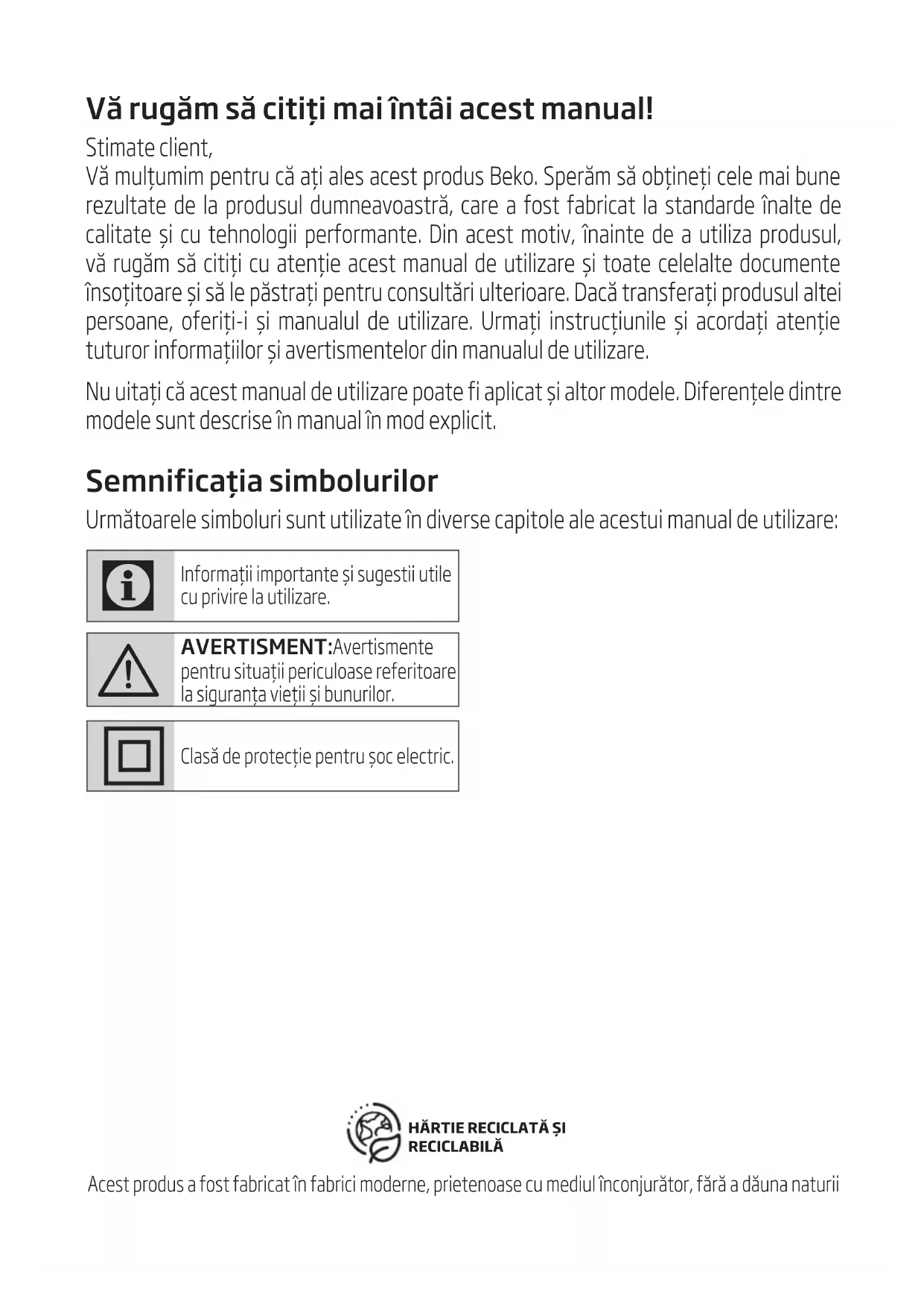 PRODUSUL NU BENEFICIAZĂ DE GARANŢIE LEGALĂ DE CONFORMITATE ÎN URMĂTOARELE CAZURI: - piesele şi accesoriile care prezintă lovituri, zgârieturi, spărturi sau deformări din vina exclusivă a consumatorului. Reclamaţiile referitoare la aspectele prevăzute mai jos, se rezolvă numai contra cost : Drepturile consumatorului sunt cele prevăzute în OUG nr. 140/2021 și OG 21/1992 (republicată). Pentru orice defecţiune aparută în perioada de garanţie legală, apelaţi la vânzător (respectiv, prin magazinul de unde a fost achiziţionat produsul sau direct prin Call Center Arctic). Prelungirea termenului de garanţie se va înscrie în certicatul de garanţie de către unitatea SERVICE care a efectuat reparaţia. Garanţia acoperă repararea şi/sau înlocuirea pieselor constatate ca neconforme în sensul OUG nr. 140/2021 (necauzate de consumator) de către tehnicienii Service Arctic. Termenul de realizare a operaţiilor de reparare, înlocuire sau întreţinere este de 15 zile calendaristice de la data la care cumpărătorul a sesizat lipsa de conformitate către vânzător (respectiv, prin magazinul de unde a achiziţionat produsul sau direct prin Call Center Arctic). Reparaţiile / înlocuirile se efectuează cu respectarea următoarelor condiţii - art. 12(1)-(5) din OUG nr. 140/2021: a) fără costuri și fără vreun inconvenient semnicativ pentru consumator, ţinând seama de natura bunurilor şi de scopul pentru care consumatorul a solicitat bunurile în cauză; b) consumatorul pune bunurile la dispoziţia vânzătorului, iar vânzătorul preia bunurile înlocuite pe propria cheltuială; c) obligaţia de a repara sau înlocui bunurile include, după caz, demontarea bunurilor neconforme şi instalarea bunurilor de înlocuire sau a bunurilor reparate sau suportarea costurilor aferente demontării şi instalării; d) consumatorul nu este obligat să plătească pentru utilizarea normală a bunurilor înlocuite în perioada care a precedat înlocuirea acestora. CONDIŢII SUPLIMENTARE DE GARANŢIE LEGALĂ DE CONFORMITATE: În cadrul acestui proces, Arctic vă prelucrează date cu caracter personal, cu respectarea legilor aplicabile privind condenţialitatea și protecţia datelor. Pentru informaţii complete despre modul în care vă prelucrăm datele, precum și despre drepturile dumneavoastră, vă rugăm să consultaţi secţiunea “Protecţia datelor personale”, accesând site-ul nostru la adresa https://www.beko.ro/.Leggere il presente manuale prima di utilizzare l’apparecchio. Gentile e stimato Cliente, Grazie per aver scelto questo apparecchio Beko. Ci auguriamo che riesca ad ottenere i risultati migliori da questo apparecchio, realizzato con tecnologia all’avanguardia e di alta qualità. Pertanto, prima di utilizzare l’apparecchio, La preghiamo di leggere con attenzione e per intero il presente manuale e ogni altro documento allegato, conservandoli come riferimento per impieghi futuri. Nel caso cedesse l’apparecchio ad altre persone, consegni loro anche questo manuale utente. Segua tutte le istruzioni prestando attenzione a tutte le informazioni e avvertenze riportate nel manuale utente. Consideri che questo manuale utente può risultare valido anche per altri modelli. Il contenuto ne descrive chiaramente le eventuali differenze. Significato dei simboli I seguenti simboli sono utilizzati in diverse sezioni del presente manuale: