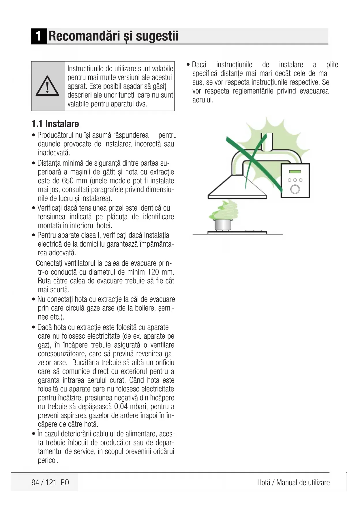 CUPRINS94 / 121 RO Hotă / Manual de utilizare 1 Recomandări şi sugestii