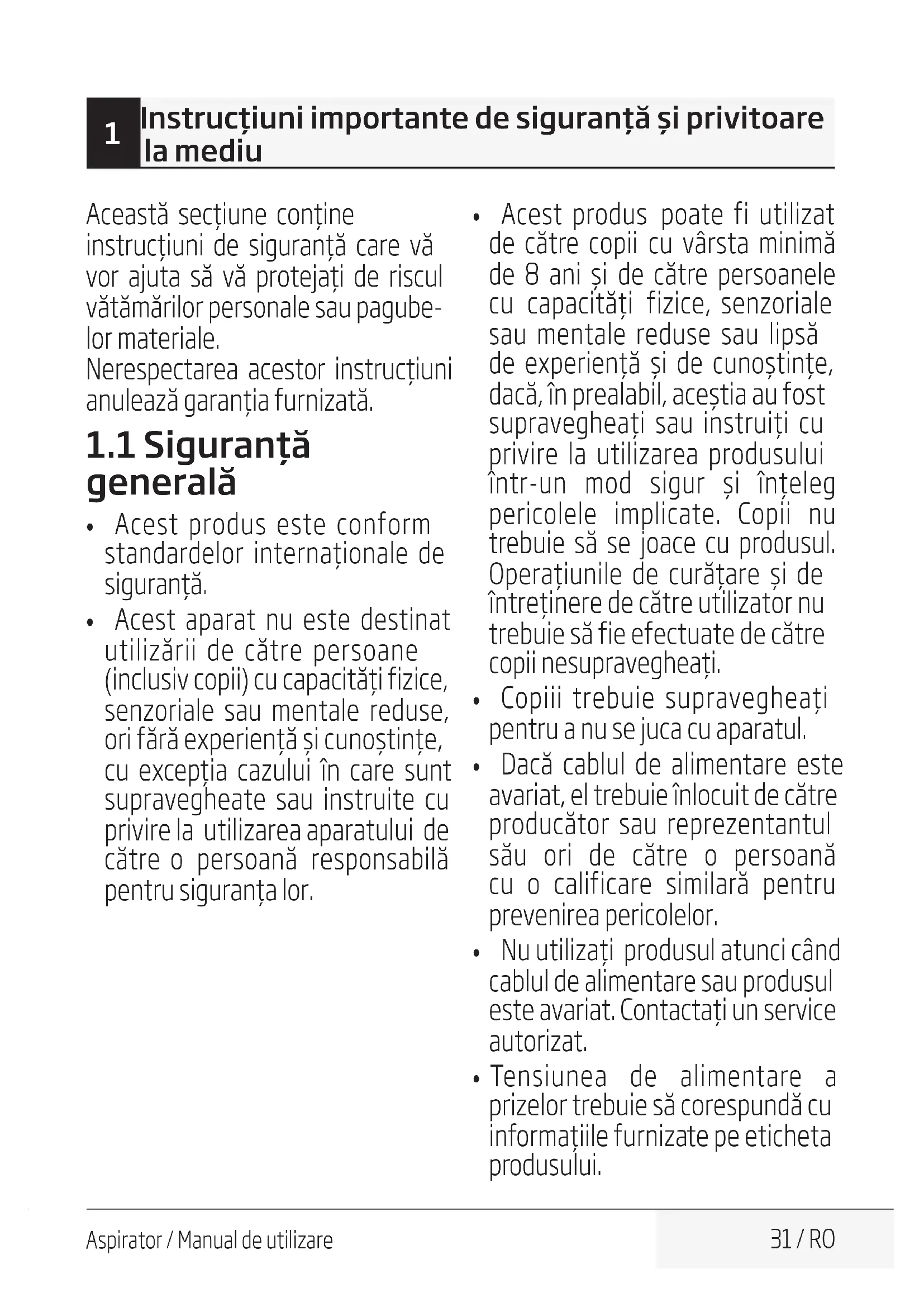 - Tensiunea de alimentare a prizelor trebuie să corespundă cu informațiile furnizate pe eticheta produsului.32 / RO Aspirator / Manual de utilizare
