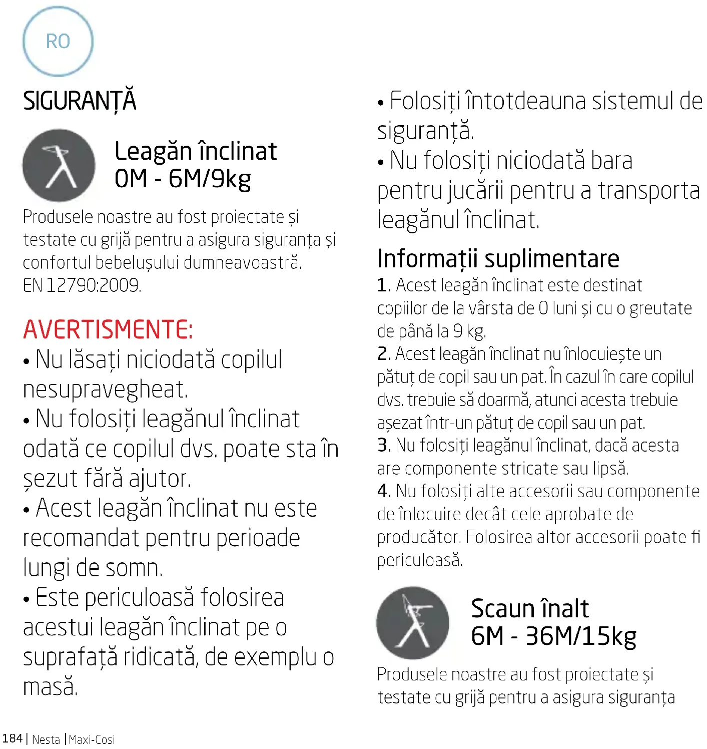 SIGURANŢĂ Leagăn înclinat 0M - 6M/9kg Produsele noastre au fost proiectate și testate cu grijă pentru a asigura siguranța și confortul bebelușului dumneavoastră. EN 12790:2009. AVERTISMENTE: