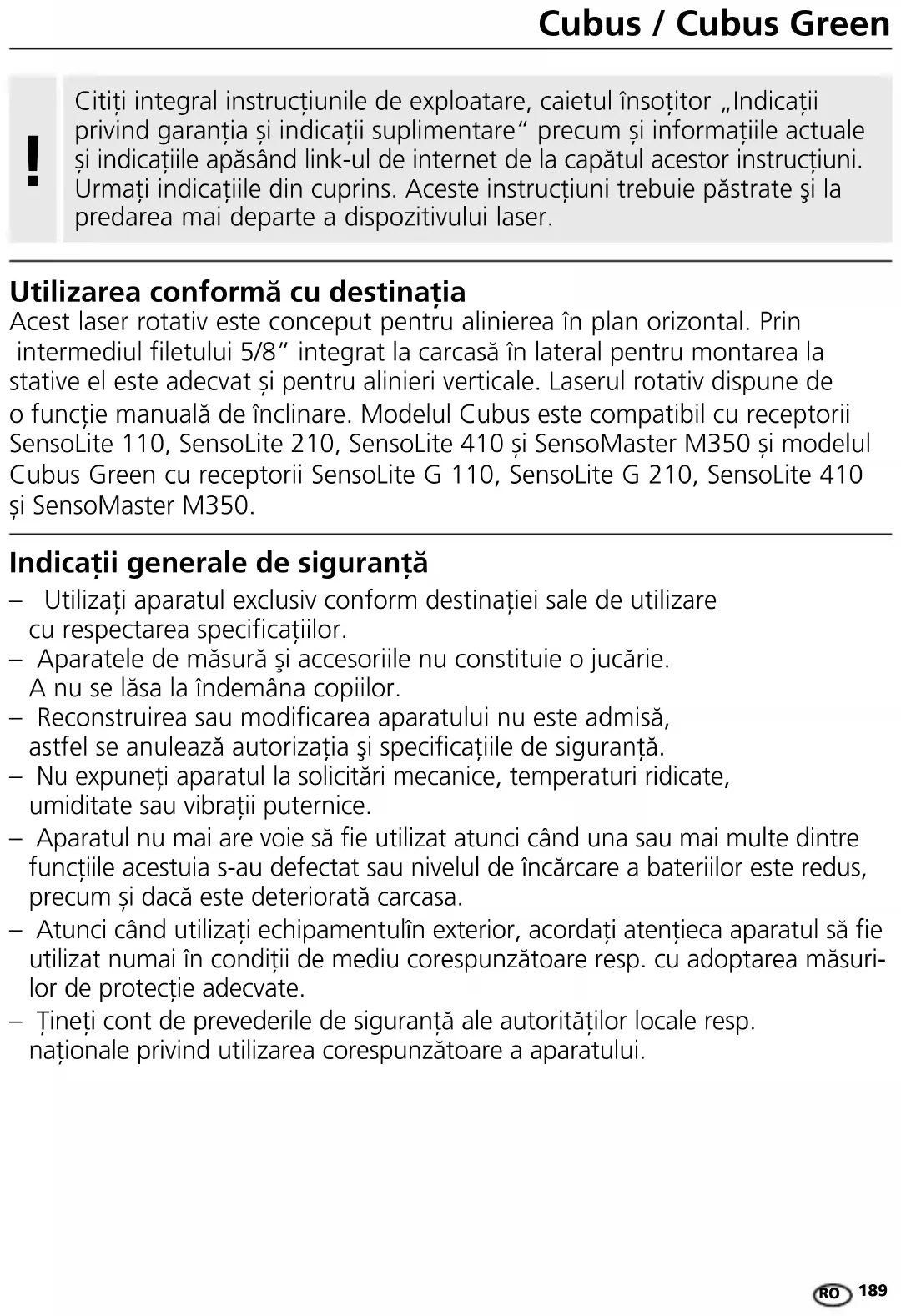– Utilizaţi aparatul exclusiv conform destinaţiei sale de utilizare cu respectarea specicaţiilor. – Aparatele de măsură şi accesoriile nu constituie o jucărie. A nu se lăsa la îndemâna copiilor. – Reconstruirea sau modicarea aparatului nu este admisă, astfel se anulează autorizaţia şi specicaţiile de siguranţă. – Nu expuneţi aparatul la solicitări mecanice, temperaturi ridicate, umiditate sau vibraţii puternice. – Aparatul nu mai are voie să e utilizat atunci când una sau mai multe dintre funcțiile acestuia s-au defectat sau nivelul de încărcare a bateriilor este redus, precum și dacă este deteriorată carcasa. – Atunci când utilizaţi echipamentulîn exterior, acordaţi atenţieca aparatul să e utilizat numai în condiţii de mediu corespunzătoare resp. cu adoptarea măsuri- lor de protecţie adecvate. – Ţineţi cont de prevederile de siguranţă ale autorităţilor locale resp. naţionale privind utilizarea corespunzătoare a aparatului. Indicaţii generale de siguranţă Utilizarea conformă cu destinația Acest laser rotativ este conceput pentru alinierea în plan orizontal. Prin intermediul filetului 5/8” integrat la carcasă în lateral pentru montarea la stative el este adecvat și pentru alinieri verticale. Laserul rotativ dispune de o funcție manuală de înclinare. Modelul Cubus este compatibil cu receptorii SensoLite 110, SensoLite 210, SensoLite 410 și SensoMaster M350 și modelul Cubus Green cu receptorii SensoLite G 110, SensoLite G 210, SensoLite 410 și SensoMaster M350. Citiți integral instrucțiunile de exploatare, caietul însoțitor „Indicații privind garanția și indicații suplimentare“ precum și informațiile actuale și indicațiile apăsând link-ul de internet de la capătul acestor instrucțiuni. Urmați indicațiile din cuprins. Aceste instrucţiuni trebuie păstrate şi la predarea mai departe a dispozitivului laser.