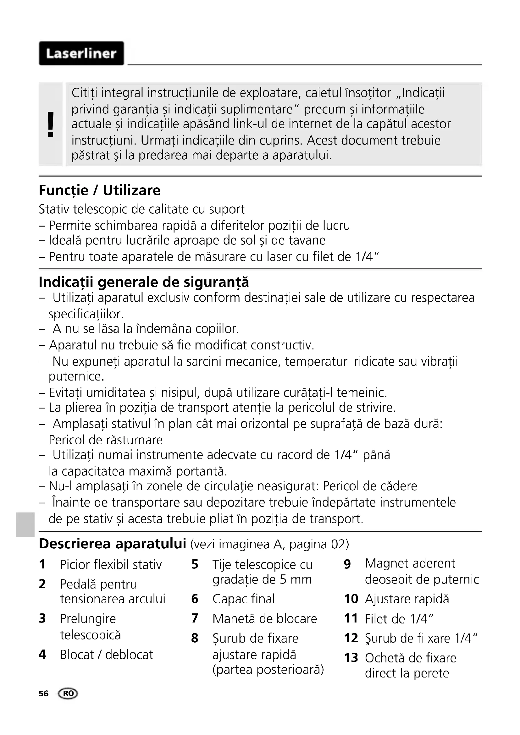 Funcţie / Utilizare Stativ telescopic de calitate cu suport – Permite schimbarea rapidă a diferitelor poziții de lucru – Ideală pentru lucrările aproape de sol și de tavane – Pentru toate aparatele de măsurare cu laser cu let de 1/4“ Citiți integral instrucțiunile de exploatare, caietul însoțitor „Indicații privind garanția și indicații suplimentare“ precum și informațiile actuale și indicațiile apăsând link-ul de internet de la capătul acestor instrucțiuni. Urmați indicațiile din cuprins. Acest document trebuie păstrat și la predarea mai departe a aparatului.