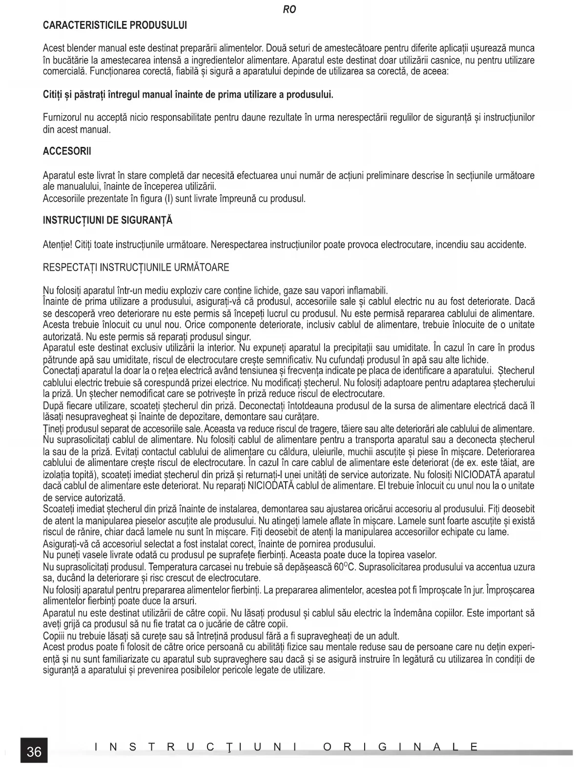 CARACTERISTICILE PRODUSULUI Acest blender manual este destinat preparării alimentelor. Două seturi de amestecătoare pentru diferite aplicații ușurează munca în bucătărie la amestecarea intensă a ingredientelor alimentare. Aparatul este destinat doar utilizării casnice, nu pentru utilizare comercială. Funcționarea corectă, fi abilă și sigură a aparatului depinde de utilizarea sa corectă, de aceea: Citiți și păstrați întregul manual înainte de prima utilizare a produsului. Furnizorul nu acceptă nicio responsabilitate pentru daune rezultate în urma nerespectării regulilor de siguranță și instrucțiunilor din acest manual. ACCESORII Aparatul este livrat în stare completă dar necesită efectuarea unui număr de acțiuni preliminare descrise în secțiunile următoare ale manualului, înainte de începerea utilizării. Accesoriile prezentate în fi gura (I) sunt livrate împreună cu produsul.