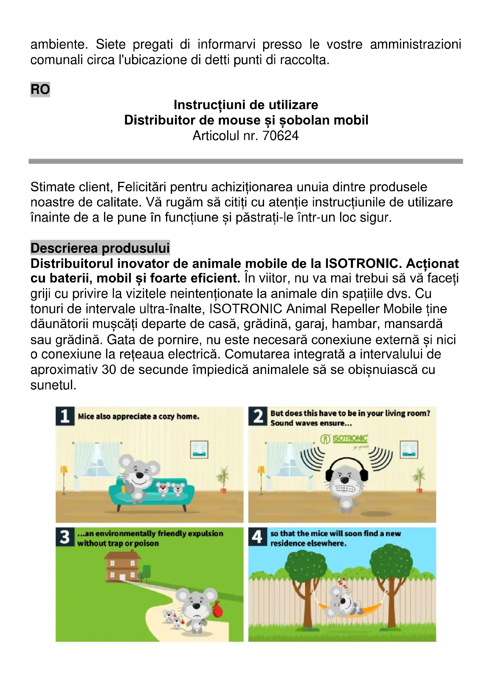 Stimate client, Felicitări pentru achiziționarea unuia dintre produsele noastre de calitate. Vă rugăm să citiți cu atenție instrucțiunile de utilizare înainte de a le pune în funcțiune și păstrați-le într-un loc sigur. Descrierea produsului Distribuitorul inovator de animale mobile de la ISOTRONIC. Acționat cu baterii, mobil și foarte eficient. În viitor, nu va mai trebui să vă faceți griji cu privire la vizitele neintenționate la animale din spațiile dvs. Cu tonuri de intervale ultra-înalte, ISOTRONIC Animal Repeller Mobile ține dăunătorii mușcăți departe de casă, grădină, garaj, hambar, mansardă sau grădină. Gata de pornire, nu este necesară conexiune externă și nici o conexiune la rețeaua electrică. Comutarea integrată a intervalului de aproximativ 30 de secunde împiedică animalele să se obișnuiască cu sunetul.Pentru a alunga definitiv animalele și a le ține deoparte, dispozitivul trebuie să rămână în uz continuu și trebuie aplicată puțină răbdare. Dispozitivele noastre funcționează cu frecvențe de prag ultra-înalte, care evită să se obișnuiască și sunt enervante pentru animale, dar nu neapărat dureroase. În funcție de specia animală, uneori poate dura până la 3 săptămâni pentru ca animalele să părăsească mediul familiar și să observi o schimbare. Diferite specii de animale reacționează diferit, de asemenea, în funcție de vârstă, rasă și mărime, dar majoritatea se vor simți mai devreme sau mai târziu tulburate în stilul lor de viață și în împrejurimile lor familiare și vor părăsi zona permanent. Important: plasarea dispozitivelor poate fi decisivă pentru eficiență. Vă rugăm să aliniați dispozitivele cu "difuzorul" direct într-o linie la locurile de relaxare și de odihnă ale animalelor. Frecvențele sunt trimise în formă de pâlnie, iar zona care trebuie protejată trebuie să se afle în această pâlnie. Alinierea necorespunzătoare poate duce la apariția unor puncte orbe în care animalele petrec mai mult timp pentru a evita frecvențele deranjante. O fixare sau atașare, de ex. în hambare este posibilă utilizarea legăturilor sau șuruburilor de cablu. Funcționare continuă, în funcție de baterie, aproximativ 12 luni. Cum funcționează Consum minim de energie electrică datorită noilor electronice. Aparatul emite tonuri de înaltă frecvență la intervale de 5 secunde (pauză de 25 de secunde). Aceste sunete, abia perceptibile pentru urechea umană, țin animalele departe de vehicul și camere. Vă rugăm să rețineți că dispozitivul poate porni în modul pauză și abia apoi trece în modul de operare. Prin urmare, nu există o defecțiune. Schimbarea bateriei
