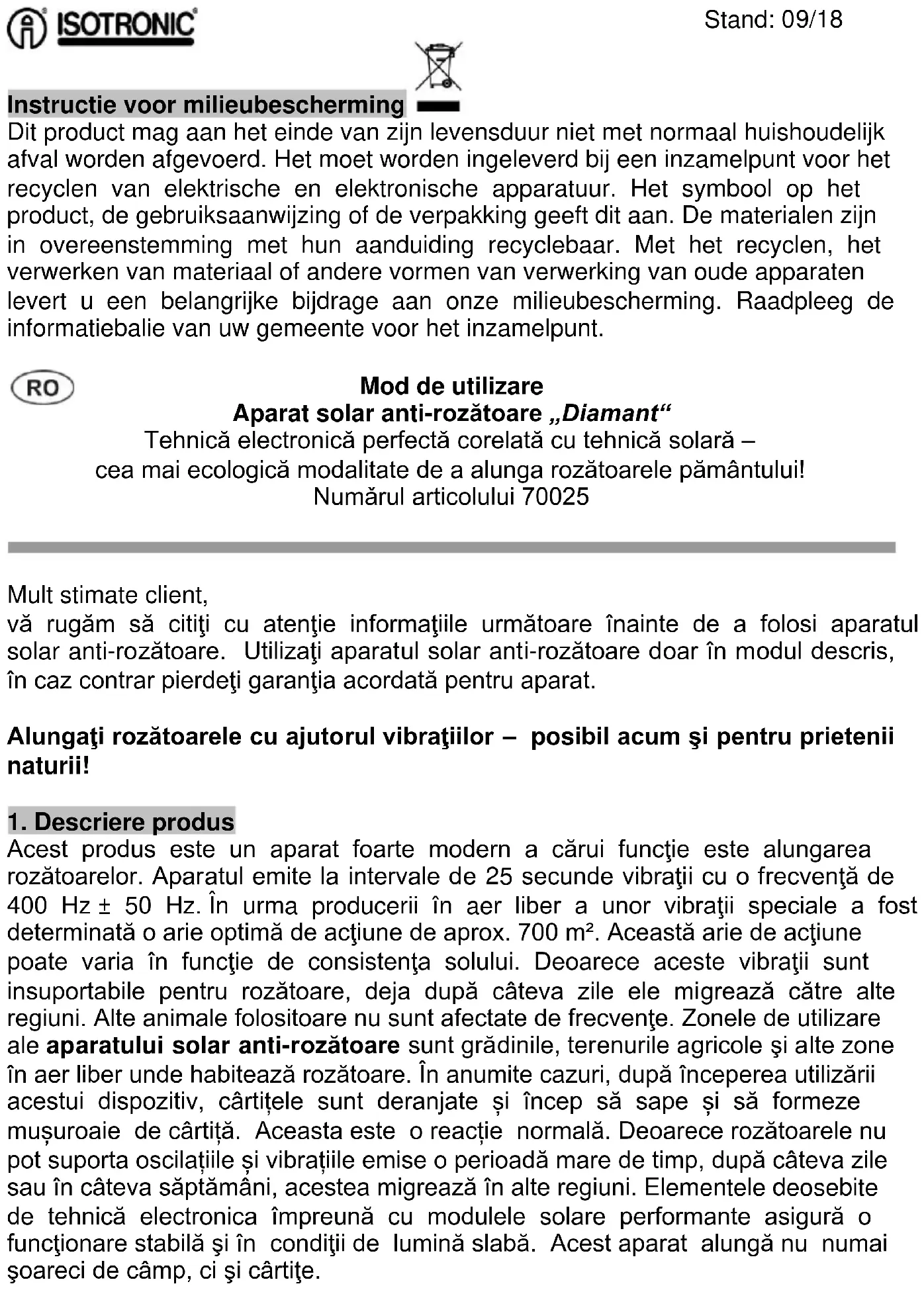 Mult stimate client, vă rugăm să citiţi cu atenţie informaţiile următoare înainte de a folosi aparatul solar anti-rozătoare. Utilizaţi aparatul solar anti-rozătoare doar în modul descris, în caz contrar pierdeţi garanţia acordată pentru aparat. Alungaţi rozătoarele cu ajutorul vibraţiilor – posibil acum şi pentru prietenii naturii!