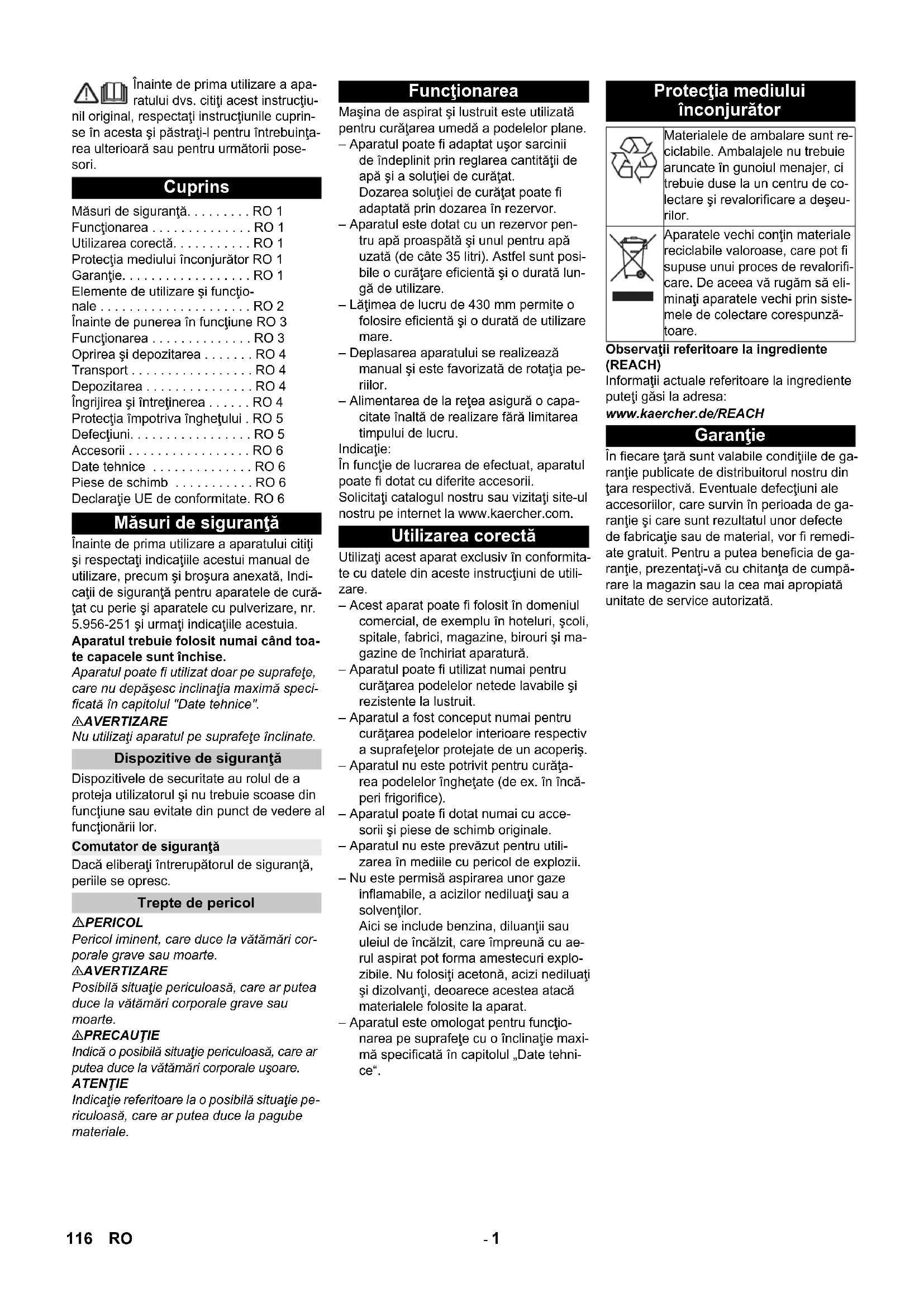Chairman of the Board of Management Director Regulatory Affairs & Certification 115PL- 1 Înainte de prima utilizare a apa- ratului dvs. citiţi acest instrucţiu- nil original, respectaţi instrucţiunile cuprin- se în acesta şi păstraţi-l pentru întrebuinţa- rea ulterioară sau pentru următorii pose- sori. Înainte de prima utilizare a aparatului citiţi şi respectaţi indicaţiile acestui manual de utilizare, precum şi broşura anexată, Indi- caţii de siguranţă pentru aparatele de cură- ţat cu perie şi aparatele cu pulverizare, nr. 5.956-251 şi urmaţi indicaţiile acestuia. Aparatul trebuie folosit numai când toa- te capacele sunt închise. Aparatul poate fi utilizat doar pe suprafeţe, care nu depăşesc inclinaţia maximă speci- ficată în capitolul "Date tehnice". 몇 AVERTIZARE Nu utilizaţi aparatul pe suprafeţe înclinate. Dispozitivele de securitate au rolul de a proteja utilizatorul şi nu trebuie scoase din funcţiune sau evitate din punct de vedere al funcţionării lor. Dacă eliberaţi întrerupătorul de siguranţă, periile se opresc. PERICOL Pericol iminent, care duce la vătămări cor- porale grave sau moarte. 몇 AVERTIZARE Posibilă situaţie periculoasă, care ar putea duce la vătămări corporale grave sau moarte. 몇 PRECAUŢIE Indică o posibilă situaţie periculoasă, care ar putea duce la vătămări corporale uşoare. ATENŢIE Indicaţie referitoare la o posibilă situaţie pe- riculoasă, care ar putea duce la pagube materiale. Maşina de aspirat şi lustruit este utilizată pentru curăţarea umedă a podelelor plane. – Aparatul poate fi adaptat uşor sarcinii de îndeplinit prin reglarea cantităţii de apă şi a soluţiei de curăţat. Dozarea soluţiei de curăţat poate fi adaptată prin dozarea în rezervor. – Aparatul este dotat cu un rezervor pen- tru apă proaspătă şi unul pentru apă uzată (de câte 35 litri). Astfel sunt posi- bile o curăţare eficientă şi o durată lun- gă de utilizare. – Lăţimea de lucru de 430 mm permite o folosire eficientă şi o durată de utilizare mare. – Deplasarea aparatului se realizează manual şi este favorizată de rotaţia pe- riilor. – Alimentarea de la reţea asigură o capa- citate înaltă de realizare fără limitarea timpului de lucru. Indicaţie: În funcţie de lucrarea de efectuat, aparatul poate fi dotat cu diferite accesorii. Solicitaţi catalogul nostru sau vizitaţi site-ul nostru pe internet la www.kaercher.com. Utilizaţi acest aparat exclusiv în conformita- te cu datele din aceste instrucţiuni de utili- zare. – Acest aparat poate fi folosit în domeniul comercial, de exemplu în hoteluri, şcoli, spitale, fabrici, magazine, birouri şi ma- gazine de închiriat aparatură. – Aparatul poate fi utilizat numai pentru curăţarea podelelor netede lavabile şi rezistente la lustruit. – Aparatul a fost conceput numai pentru curăţarea podelelor interioare respectiv a suprafeţelor protejate de un acoperiş. – Aparatul nu este potrivit pentru curăţa- rea podelelor îngheţate (de ex. în încă- peri frigorifice). – Aparatul poate fi dotat numai cu acce- sorii şi piese de schimb originale. – Aparatul nu este prevăzut pentru utili- zarea în mediile cu pericol de explozii. – Nu este permisă aspirarea unor gaze inflamabile, a acizilor nediluaţi sau a solvenţilor. Aici se include benzina, diluanţii sau uleiul de încălzit, care împreună cu ae- rul aspirat pot forma amestecuri explo- zibile. Nu folosiţi acetonă, acizi nediluaţi şi dizolvanţi, deoarece acestea atacă materialele folosite la aparat. – Aparatul este omologat pentru funcţio- narea pe suprafeţe cu o înclinaţie maxi- mă specificată în capitolul „Date tehni- ce“. Observaţii referitoare la ingrediente (REACH) Informaţii actuale referitoare la ingrediente puteţi găsi la adresa: www.kaercher.de/REACH În fiecare ţară sunt valabile condiţiile de ga- ranţie publicate de distribuitorul nostru din ţara respectivă. Eventuale defecţiuni ale accesoriilor, care survin în perioada de ga- ranţie şi care sunt rezultatul unor defecte de fabricaţie sau de material, vor fi remedi- ate gratuit. Pentru a putea beneficia de ga- ranţie, prezentaţi-vă cu chitanţa de cumpă- rare la magazin sau la cea mai apropiată unitate de service autorizată. Cuprins Măsuri de siguranţă. . . . . . . . . RO 1 Funcţionarea . . . . . . . . . . . . . . RO 1 Utilizarea corectă. . . . . . . . . . . RO 1 Protecţia mediului înconjurător RO 1 Garanţie. . . . . . . . . . . . . . . . . . RO 1 Elemente de utilizare şi funcţio- nale . . . . . . . . . . . . . . . . . . . . . RO 2 Înainte de punerea în funcţiune RO 3 Funcţionarea . . . . . . . . . . . . . . RO 3 Oprirea şi depozitarea . . . . . . . RO 4 Transport . . . . . . . . . . . . . . . . . RO 4 Depozitarea . . . . . . . . . . . . . . . RO 4 Îngrijirea şi întreţinerea . . . . . . RO 4 Protecţia împotriva îngheţului . RO 5 Defecţiuni. . . . . . . . . . . . . . . . . RO 5 Accesorii . . . . . . . . . . . . . . . . . RO 6 Date tehnice . . . . . . . . . . . . . . RO 6 Piese de schimb . . . . . . . . . . . RO 6 Declaraţie UE de conformitate. RO 6 Măsuri de siguranţă Dispozitive de siguranţă Comutator de siguranţă Trepte de pericol Funcţionarea Utilizarea corectă Protecţia mediului înconjurător Materialele de ambalare sunt re- ciclabile. Ambalajele nu trebuie aruncate în gunoiul menajer, ci trebuie duse la un centru de co- lectare şi revalorificare a deşeu- rilor. Aparatele vechi conţin materiale reciclabile valoroase, care pot fi supuse unui proces de revalorifi- care. De aceea vă rugăm să eli- minaţi aparatele vechi prin siste- mele de colectare corespunză- toare. Garanţie 116 RO- 2 1 Filtru de trecere 2 Comutator de siguranţă 3 Furtun de evacuare apă uzată cu dispo- zitiv de dozare 4 Şină de suport pentru Homebase 5 Plutitorul 6 Rezervor de apă curată 7 Capac rezervor de apă curată 8