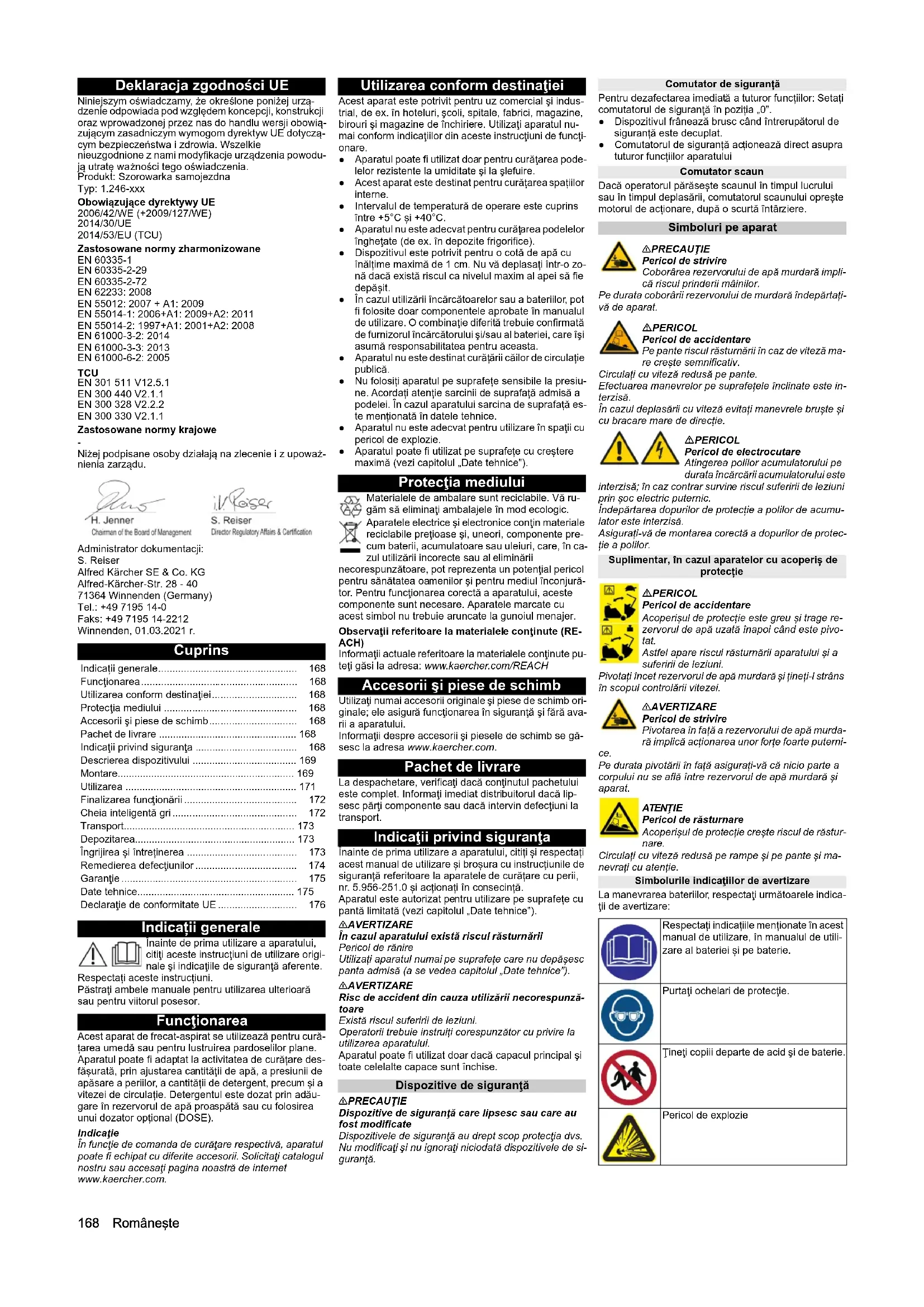 Niżej podpisane osoby działają na zlecenie i z upoważ- nienia zarządu. Administrator dokumentacji: S. Reiser Alfred Kärcher SE & Co. KG Alfred-Kärcher-Str. 28 - 40 71364 Winnenden (Germany) Tel.: +49 7195 14-0 Faks: +49 7195 14-2212 Winnenden, 01.03.2021 r. Cuprins Indicații generale Înainte de prima utilizare a aparatului, citiţi aceste instrucţiuni de utilizare origi- nale şi indicaţiile de siguranţă aferente. Respectați aceste instrucțiuni. Păstraţi ambele manuale pentru utilizarea ulterioară sau pentru viitorul posesor. Funcţionarea Acest aparat de frecat-aspirat se utilizează pentru cură- țarea umedă sau pentru lustruirea pardoselilor plane. Aparatul poate fi adaptat la activitatea de curățare des- fășurată, prin ajustarea cantității de apă, a presiunii de apăsare a periilor, a cantității de detergent, precum și a vitezei de circulație. Detergentul este dozat prin adău- gare în rezervorul de apă proaspătă sau cu folosirea unui dozator opțional (DOSE). Indicaţie În funcţie de comanda de curăţare respectivă, aparatul poate fi echipat cu diferite accesorii. Solicitaţi catalogul nostru sau accesaţi pagina noastră de internet www.kaercher.com. Utilizarea conform destinaţiei Acest aparat este potrivit pentru uz comercial şi indus- trial, de ex. în hoteluri, şcoli, spitale, fabrici, magazine, birouri şi magazine de închiriere. Utilizaţi aparatul nu- mai conform indicaţiilor din aceste instrucţiuni de funcţi- onare. ● Aparatul poate fi utilizat doar pentru curăţarea pode- lelor rezistente la umiditate şi la şlefuire. ● Acest aparat este destinat pentru curățarea spațiilor interne. ● Intervalul de temperatură de operare este cuprins între +5°C și +40°C. ● Aparatul nu este adecvat pentru curăţarea podelelor îngheţate (de ex. în depozite frigorifice). ● Dispozitivul este potrivit pentru o cotă de apă cu înălțime maximă de 1 cm. Nu vă deplasați într-o zo- nă dacă există riscul ca nivelul maxim al apei să fie depășit. ● În cazul utilizării încărcătoarelor sau a bateriilor, pot fi folosite doar componentele aprobate în manualul de utilizare. O combinaţie diferită trebuie confirmată de furnizorul încărcătorului şi/sau al bateriei, care îş