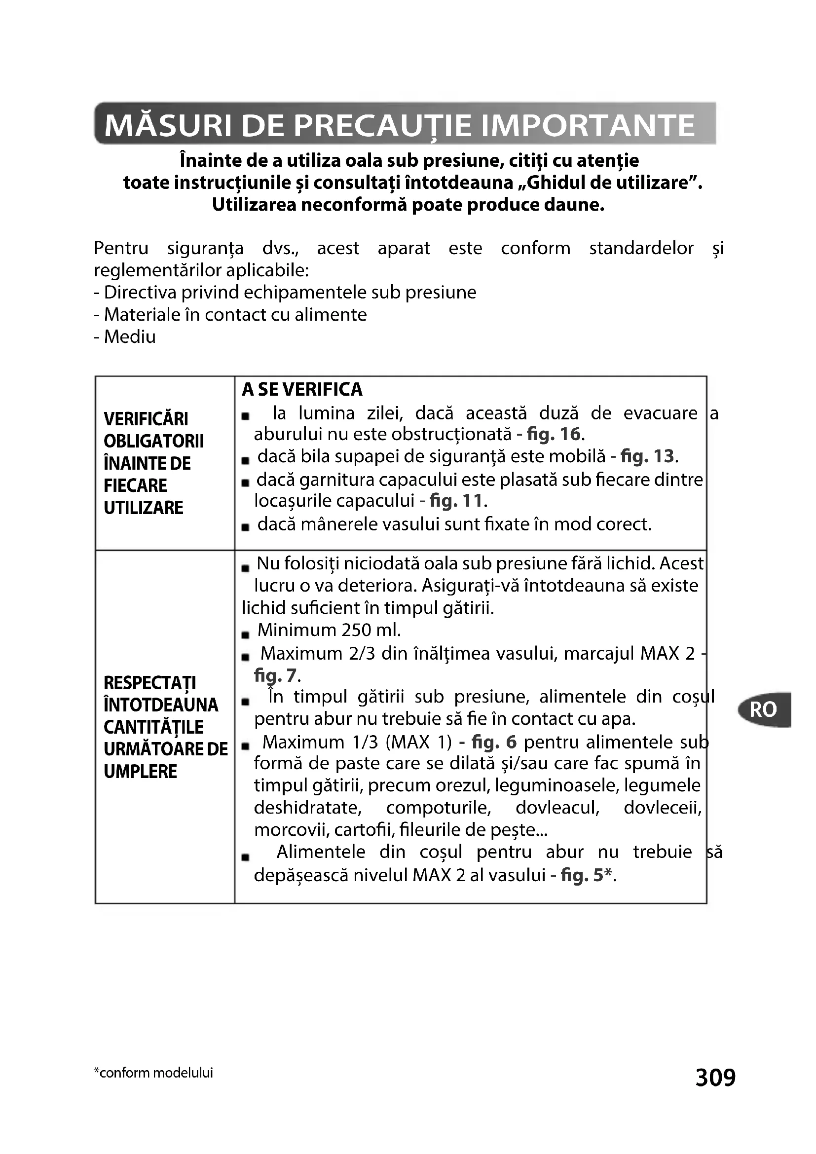 Înainte de a utiliza oala sub presiune, citiți cu atenție toate instrucțiunile și consultați întotdeauna „Ghidul de utilizare”. Utilizarea neconformă poate produce daune. Pentru siguranța dvs., acest aparat este conform standardelor și reglementărilor aplicabile: - Directiva privind echipamentele sub presiune - Materiale în contact cu alimente - Mediu VERIFICĂRI OBLIGATORII ÎNAINTE DE FIECARE UTILIZARE