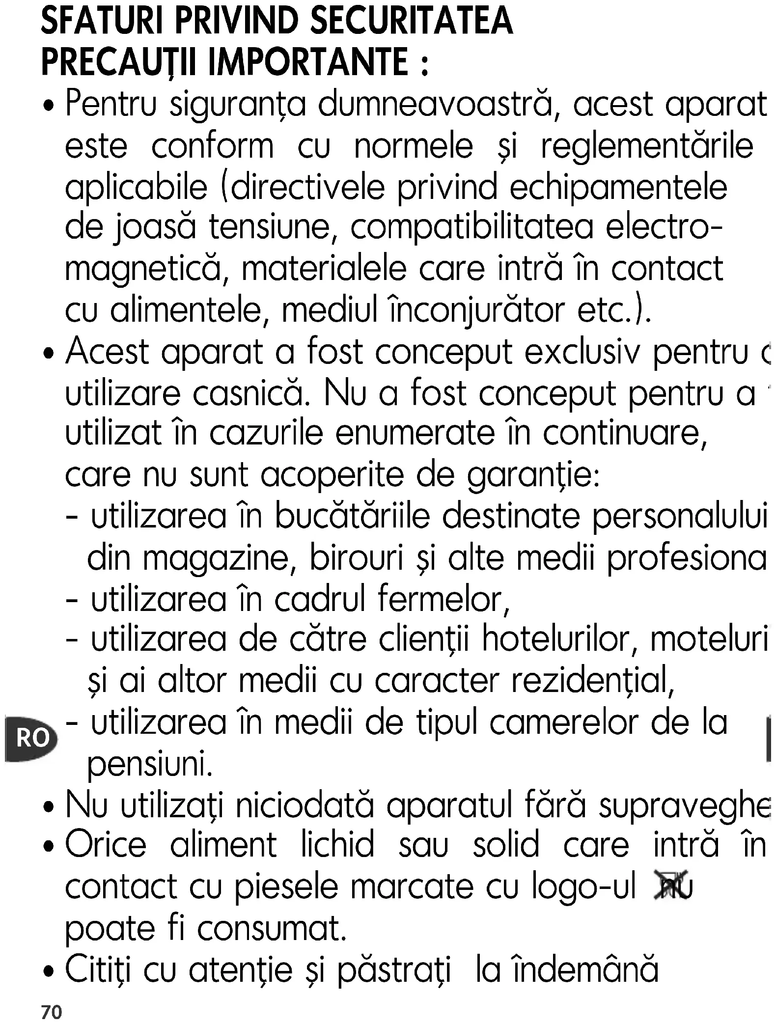 Acest aparat a fost conceput exclusiv pentru o utilizare casnică. Nu a fost conceput pentru a fi utilizat în cazurile enumerate în continuare, care nu sunt acoperite de garanţie: - utilizarea în bucătăriile destinate personalului din magazine, birouri şi alte medii profesionale, - utilizarea în cadrul fermelor, - utilizarea de către clienţii hotelurilor, motelurilor şi ai altor medii cu caracter rezidenţial, - utilizarea în medii de tipul camerelor de la pensiuni.
