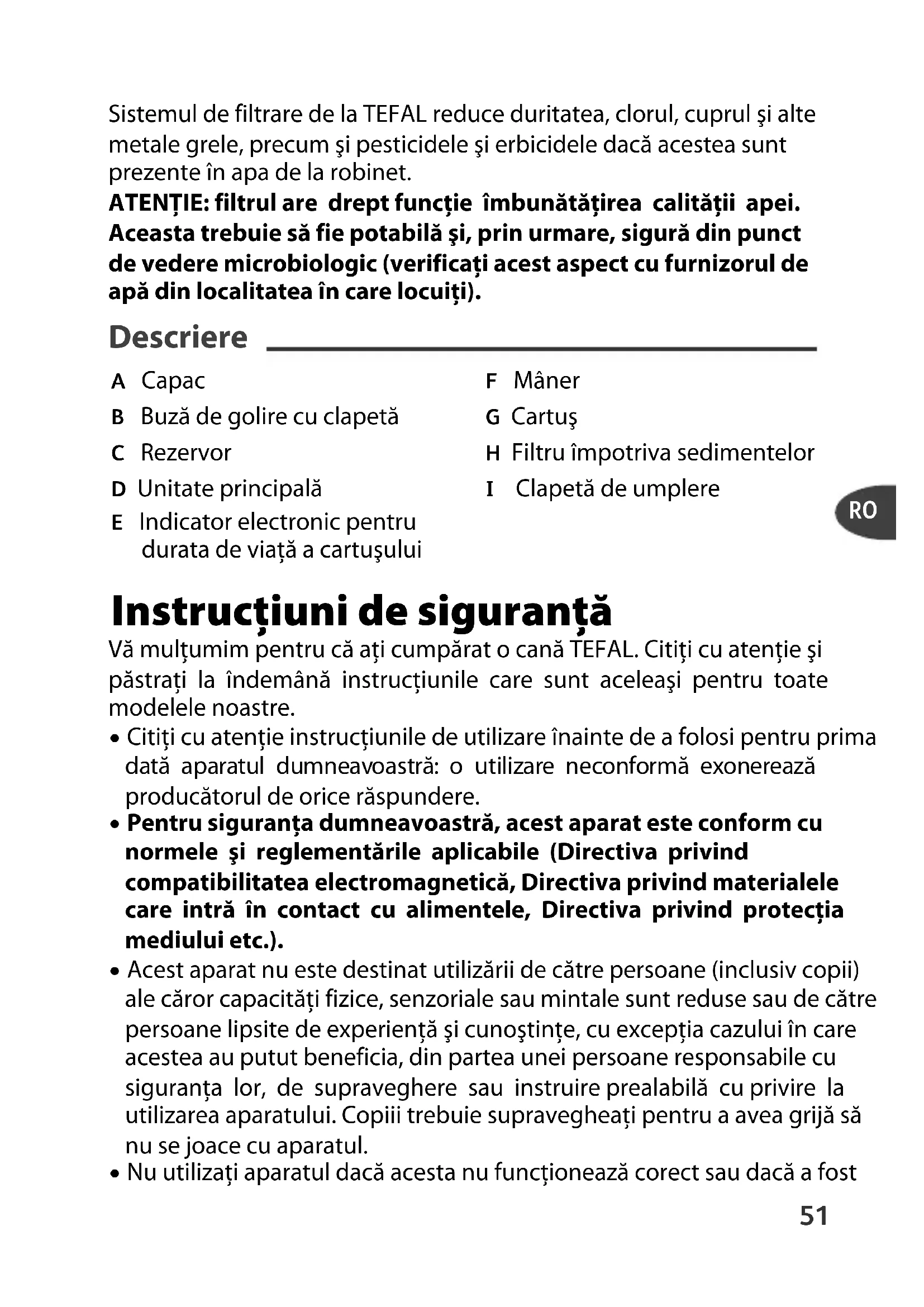 Sistemul de filtrare de la TEFAL reduce duritatea, clorul, cuprul şi alte metale grele, precum şi pesticidele şi erbicidele dacă acestea sunt prezente în apa de la robinet. ATENŢIE: filtrul are drept funcţie îmbunătăţirea calităţii apei. Aceasta trebuie să fie potabilă şi, prin urmare, sigură din punct de vedere microbiologic (verificaţi acest aspect cu furnizorul de apă din localitatea în care locuiţi). Descriere Instrucţiuni de siguranţă Vă mulţumim pentru că aţi cumpărat o cană TEFAL. Citiţi cu atenţie şi păstraţi la îndemână instrucţiunile care sunt aceleaşi pentru toate modelele noastre.