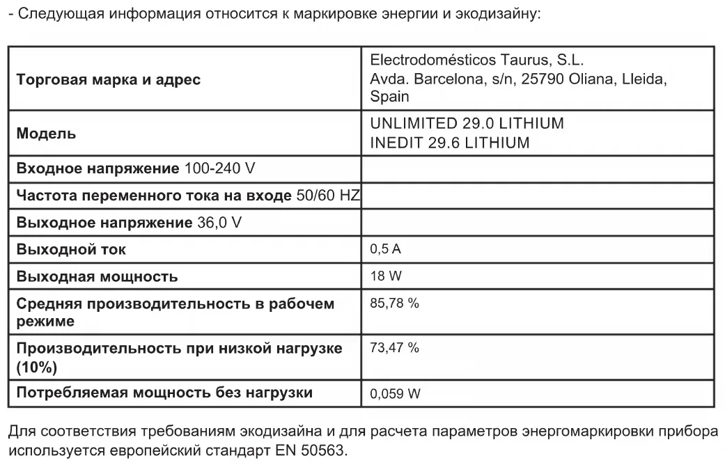 CUM URMEAZĂ: - Deschideţi carcasa superioară a aparatului, prin scoaterea iniţială a şuruburilor de xare cu ajutorul unei şurubelniţe. (Fig 8) - Identicaţi rele bateriei şi tăiaţi-le. Pentru prevenirea riscului de scurt-circuit de la posibila putere rămasă în baterie, după tăierea ecărui cablu, utilizaţi bandă izolatoare pentru a proteja capătul acestuia. (Fig. 8) - Scoateţi cu atenţie bateria din compartimentul său. Acest aparat respectă Directiva 2014/35/EU privind tensiunile joase, Directiva 2014/30/EU privind compatibilitatea electromagnetică, Direc- tiva 2011/65/EU privind restricţiile de utilizare a anumitor substanţe periculoase în echipamen- tele electrice şi electronice, precum şi Directiva 2009/125/EC privind proiectarea ecologică a produselor cu impact energetic. - Următoarele informații sunt referitoare la etichetarea energetică și proiectarea ecologică: Marca şi adresa Electrodomésticos Taurus, S.L. Avda. Barcelona, s/n, 25790 Oliana, Lleida, Spain Model UNLIMITED 29.0 LITHIUM INEDIT 29.6 LITHIUM Tensiune de intrare 100-240 V Frecvenţa c.a. de intrare 50/60 HZ Tensiune de ieşire 36,0 V Curent de ieşire 0,5 A Randament mediu în mod active 18 W Randament mediu îmod activ 85,78 % Randamentul la sarcina redusă (10%) 73,47 % Puterea absorbită în regim fără sarcină 0,059 W Pentru a stabili conformitatea cu cerințele de proiectare ecologică și pentru calcularea parametrilor de etichetare cu referire la energie a aparatului, standardul european EN 50563 este utilizat ca referință.Български Аспиратор тип “метла” Unlimited 29.0 Lithium Inedit 29.6 Lithium Guzzler 29.0 Lithium Уважаеми клиенти: Благодарим Ви, че закупихте продукт с марка TAURUS. Технологията, дизайнът и функционалността на същия, както и фактът, че надвишава най- стриктните норми за качество, ще Ви донесат пълно и дълготрайно задоволство от него.