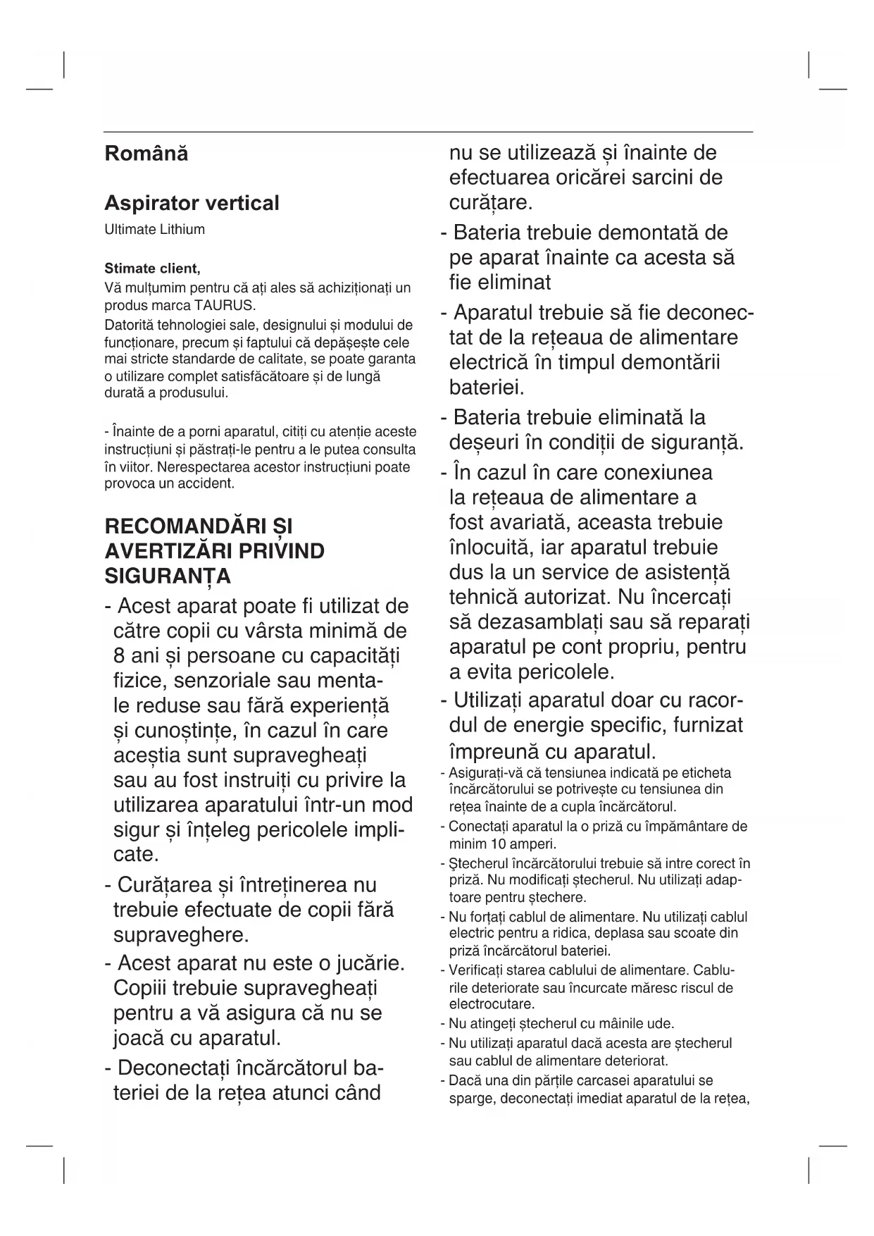 Ultimate Lithium - Aspirator TAURUS - Manual de utilizare gratuit