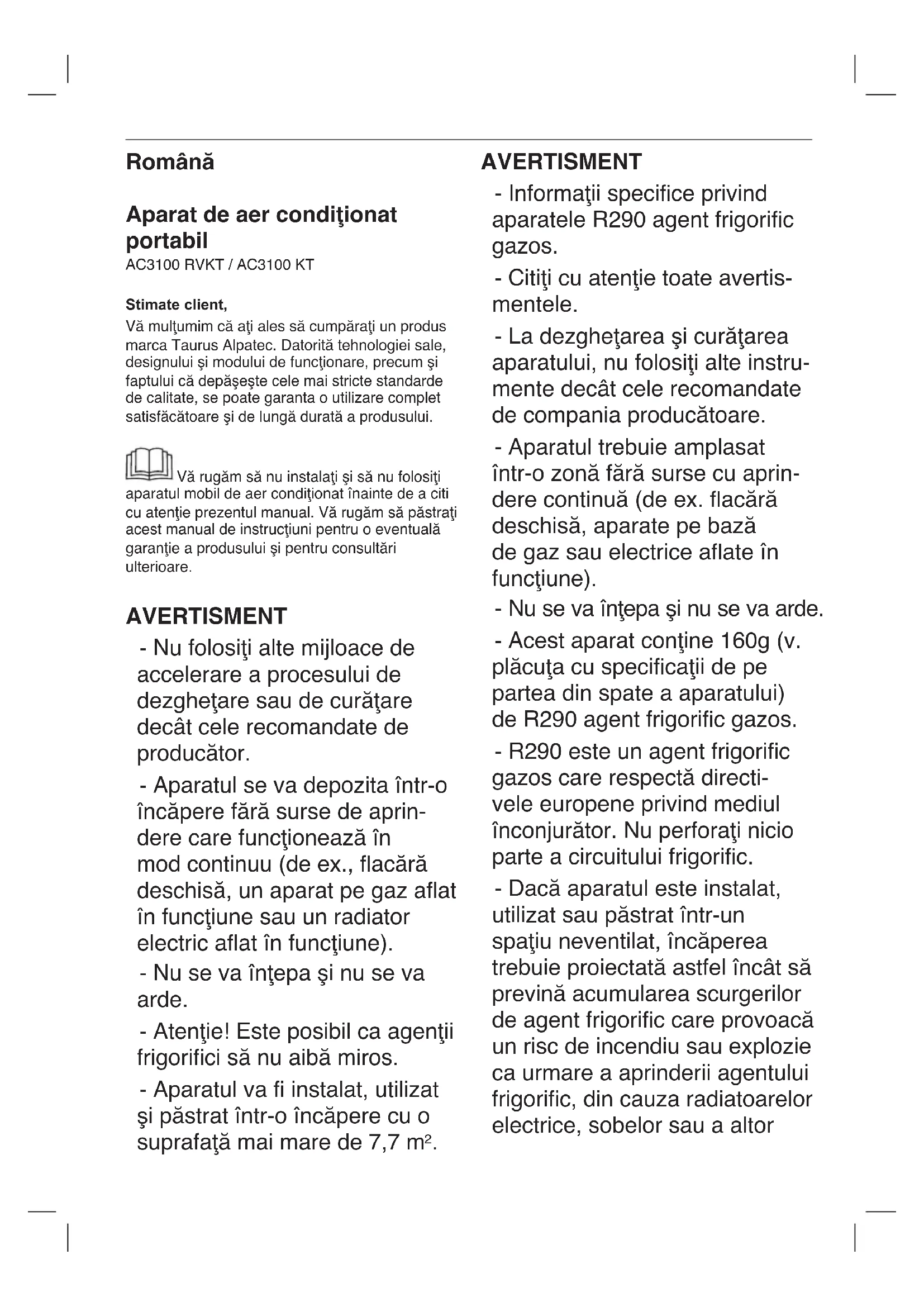Stimate client, Vă mulţumim că aţi ales să cumpăraţi un produs marca Taurus Alpatec. Datorită tehnologiei sale, designului şi modului de funcţionare, precum şi faptului că depăşeşte cele mai stricte standarde de calitate, se poate garanta o utilizare complet satisfăcătoare şi de lungă durată a produsului. Vă rugăm să nu instalaţi şi să nu folosiţi aparatul mobil de aer condiţionat înainte de a citi cu atenţie prezentul manual. Vă rugăm să păstraţi acest manual de instrucţiuni pentru o eventuală garanţie a produsului şi pentru consultări ulterioare. AVERTISMENT - Nu folosiţi alte mijloace de accelerare a procesului de dezgheţare sau de curăţare decât cele recomandate de producător. - Aparatul se va depozita într-o încăpere fără surse de aprin- dere care funcţionează în mod continuu (de ex., acără deschisă, un aparat pe gaz aat în funcţiune sau un radiator electric aat în funcţiune). - Nu se va înţepa şi nu se va arde. - Atenţie! Este posibil ca agenţii frigorici să nu aibă miros. - Aparatul va instalat, utilizat şi păstrat într-o încăpere cu o suprafaţă mai mare de 7,7 m
