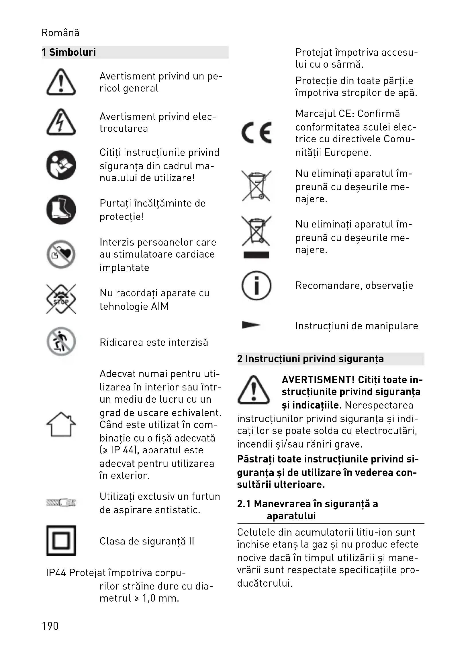 [1-6]. – Nu atingeţi intrarea de încărca re CA [1-1]. – Nu atingeţi cu degetele, bijuteriile sau alte obiecte metalice racorduri le şi contactele electrice. – Nu depozitaţi sau amplasaţi în me dii cu potenţial exploziv. – Nu scufundaţi în apă stătătoare. – Menţineţi închis capacul de protec ţie al ieşirii de CA [1-2] în timpul încărcării. – Menţineţi închis capacul Systaine rului [1-5] în timpul funcţionării şi al depozitării. – Evitaţi depozitarea la temperaturi ridicate (max. 45 °C). Ţineţi aparatul la distanţă de sursele de căldură ex terne (de exemplu, expunerea înde lungată la soare, foc). – Nu curăţaţi umed (mai ales, nu cu răţaţi cu un aparat de curăţare cu înaltă presiune). – Nu utilizaţi substanţe chimice, car buranţi sau lubrifianţi (de exemplu, pentru curăţare). – Acest aparat nu trebuie utilizat de persoanele care pot fi uşor expuse şocurilor electrice (de exemplu, persoanele care au implantate sti mulatoare cardiace), deoarece nu poate fi exclusă încărcarea statică a aparatului şi a consumatorilor co nectaţi. – Persoanele cu dizabilităţi şi copiii nu au voie să utilizeze acest aparat sau au voie să-l utilizeze numai sub supraveghere. – Nu utilizaţi la altitudini de peste 2000 m deasupra nivelului mării. – Nu-l utilizaţi pe post de scară. – Nu utilizaţi ca suport sau ca banc de lucru provizoriu. – Nu suspendaţi de o macara. – Nu este permisă eliminarea apara tului şi a acumulatorului în foc sau într-un cuptor încins şi nici distru gerea sau tăierea mecanică a aces tora, în caz contrar, se poate pro duce o explozie. Pentru informaţii privind eliminarea corectă, consul taţi capitolul 11