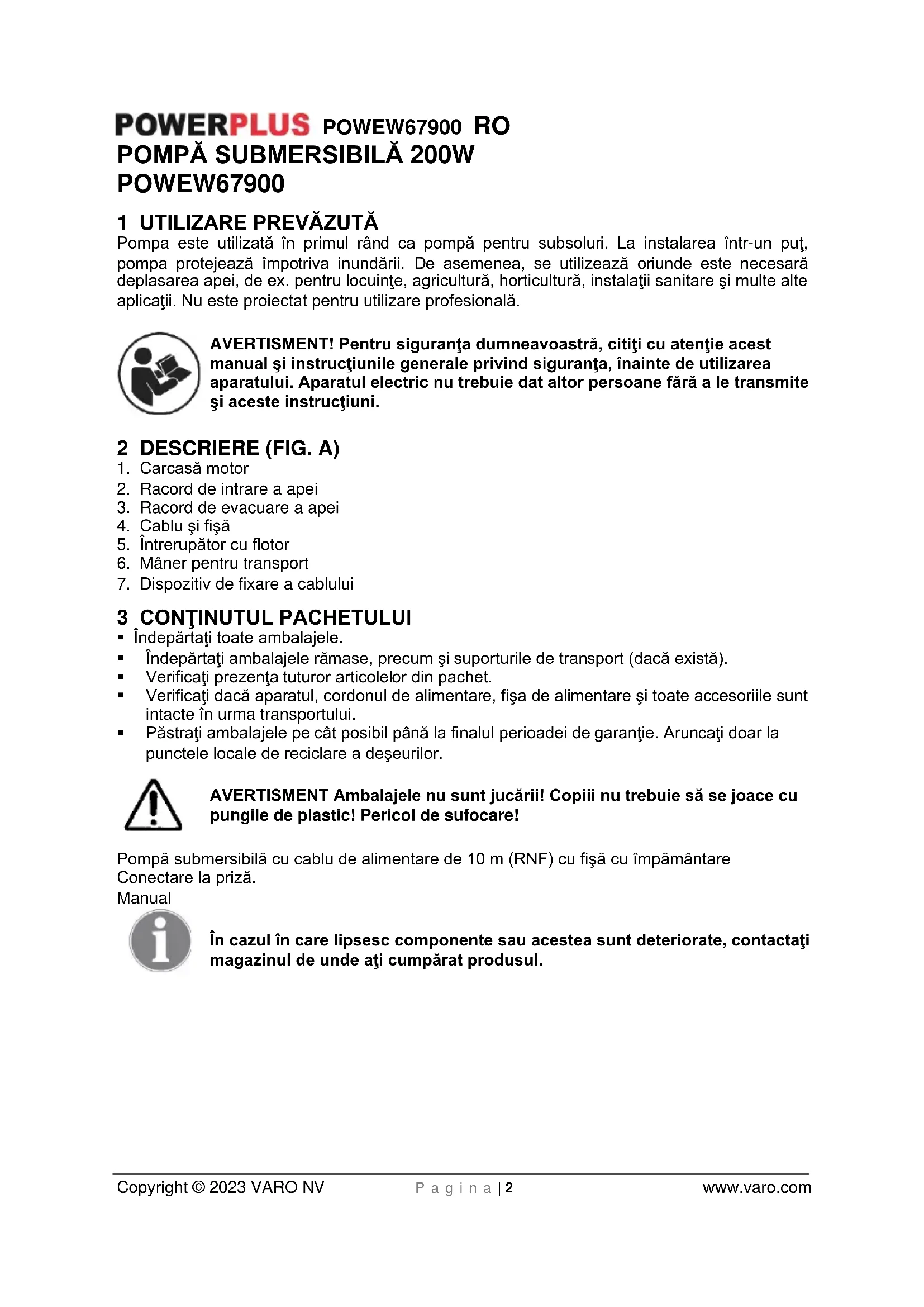 - La instalarea întrerupătorului cu flotor, verificaţi ca acesta să nu atingă baza înainte de oprirea pompei. Atenţie! Pericol de mers în gol.POWEW67900 RO Copyright © 2023 VARO NV P a g i n a | 5 www.varo.com Este interzisă utilizarea aparatului de către copii sau persoane cu dizabilităţi fizice, mintale sau de dezvoltare, ori de către persoane neexperimentate sau nepregătite, cu excepţia cazurilor în care astfel de persoane sunt instruite de o persoană care răspunde de siguranţa lor, de un supraveghetor, sau prin studierea instrucţiunilor de mai sus referitoare la utilizarea aparatului.