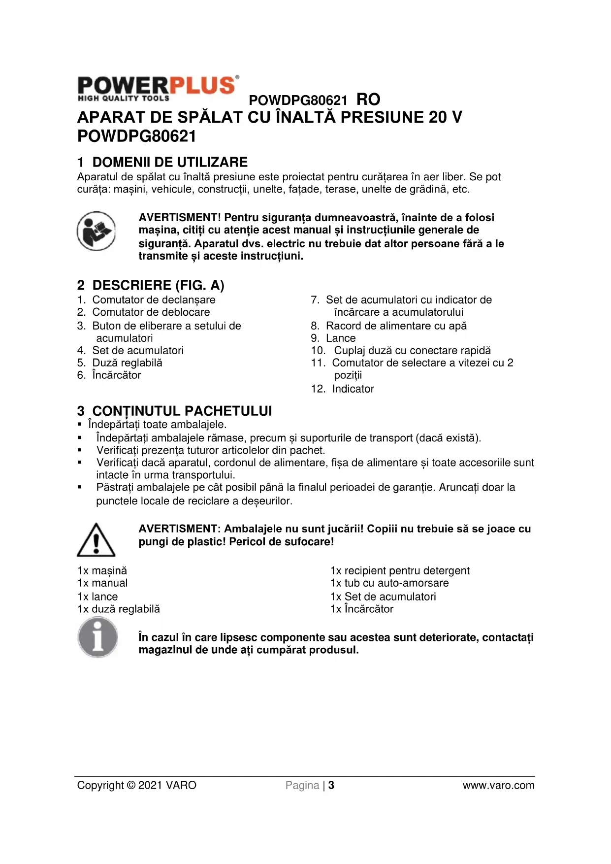 - Nu încercați să efectuați reglări în timp ce motorul este în funcțiune. AVERTISMENT: Furtunurile de înaltă presiune, fitingurile și racordurile sunt importante pentru siguranța aparatului. Utilizați doar furtunuri, fitinguri și racorduri recomandate de producător.POWDPG80621 RO Copyright © 2021 VARO Pagina | 7 www.varo.com