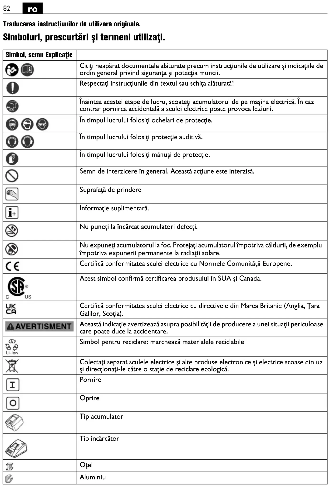 Traducerea instrucțiunilor de utilizare originale. Simboluri, prescurtări şi termeni utilizaţi. Simbol, semn Explicaţie Citiţi neapărat documentele alăturate precum instrucţiunile de utilizare şi indicaţiile de ordin general privind siguranţa şi potecţia muncii. Respectaţi instrucţiunile din textul sau schiţa alăturată! Înaintea acestei etape de lucru, scoateţi acumulatorul de pe maşina electrică. În caz contrar pornirea accidentală a sculei electrice poate provoca leziuni. În timpul lucrului folosiţi ochelari de protecţie. În timpul lucrului folosiţi protecţie auditivă. În timpul lucrului folosiţi mănuşi de protecţie. Semn de interzicere în general. Această acţiune este interzisă. Suprafaţă de prindere Informaţie suplimentară. Nu puneţi la încărcat acumulatori defecţi. Nu expuneţi acumulatorul la foc. Protejaţi acumulatorul împotriva căldurii, de exemplu împotriva expunerii permanente la radiaţii solare. Certifică conformitatea sculei electrice cu Normele Comunităţii Europene. Acest simbol confirmă certificarea produsului în SUA şi Canada. Certifică conformitatea sculei electrice cu directivele din Marea Britanie (Anglia, Țara Galilor, Scoția). Această indicaţie avertizează asupra posibilităţii de producere a unei situaţii periculoase care poate duce la accidentare. Simbol pentru reciclare: marchează materialele reciclabile Colectaţi separat sculele electrice şi alte produse electronice şi electrice scoase din uz şi direcţionaţi-le către o staţie de reciclare ecologică. Pornire Oprire Tip acumulator Tip încărcător Oţel Aluminiu83