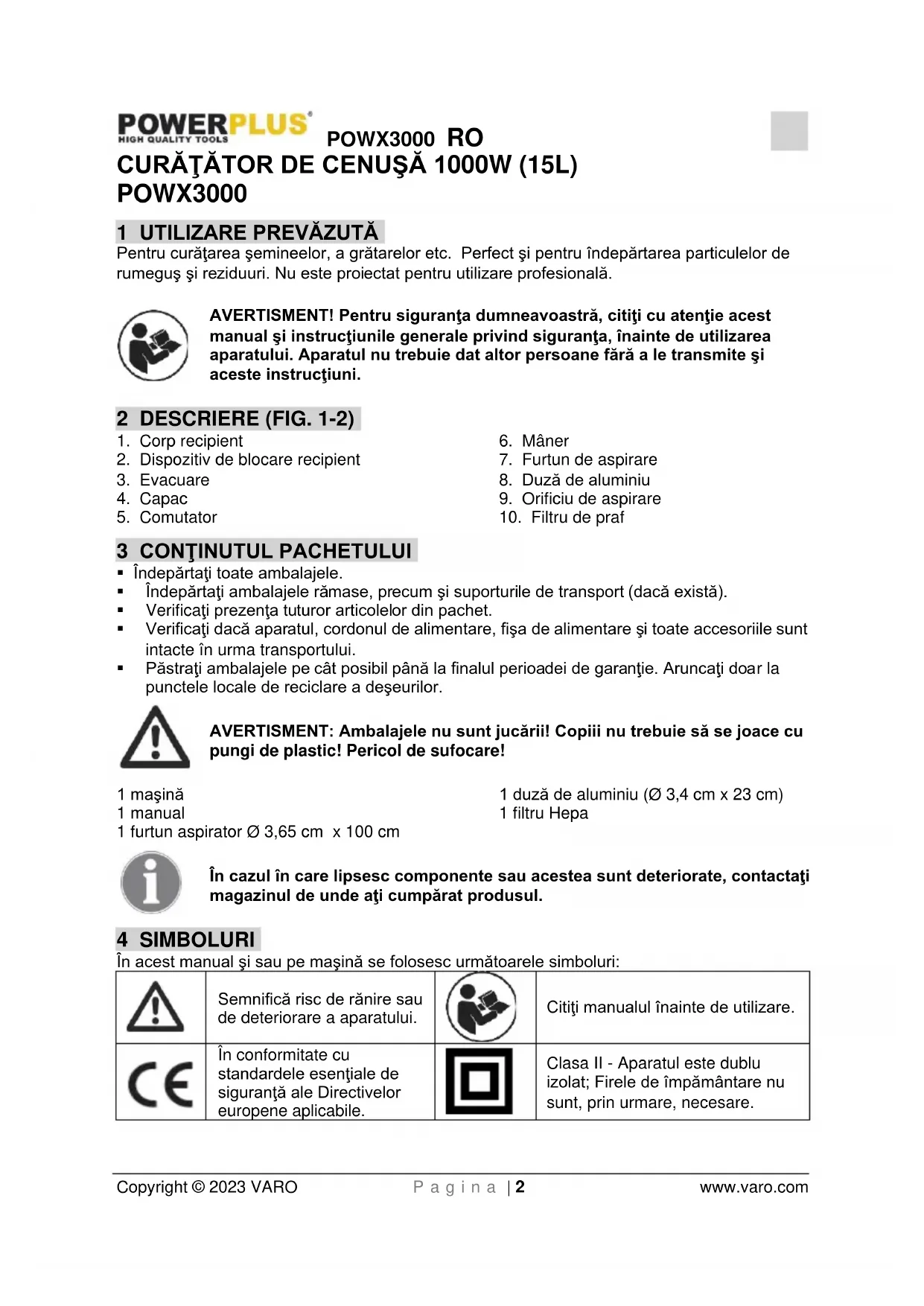 Clasa II - Aparatul este dublu izolat; Firele de împământare nu sunt, prin urmare, necesare.POWX3000 RO Copyright © 2023 VARO P a g i n a | 3 www.varo.com